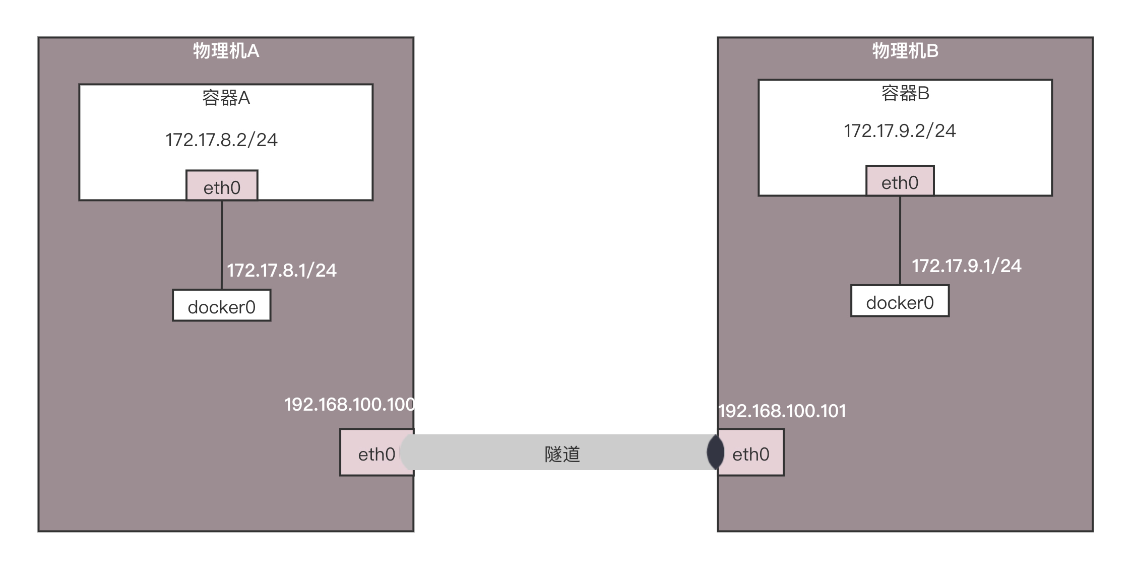 第二种方式,还是在物理机A和物理机B之间打一个隧道,这个隧道有两个端点,在端点上进行封装,将容器的IP作为乘客协议放在隧道里面,而物理主机的IP放在外面作为承载协议。这样不管外层的IP通过传统的物理网络,走多少跳到达目标物理机,从隧道两端看起来,物理机A的下一跳就是物理机B,这样前面的逻辑才能成立。