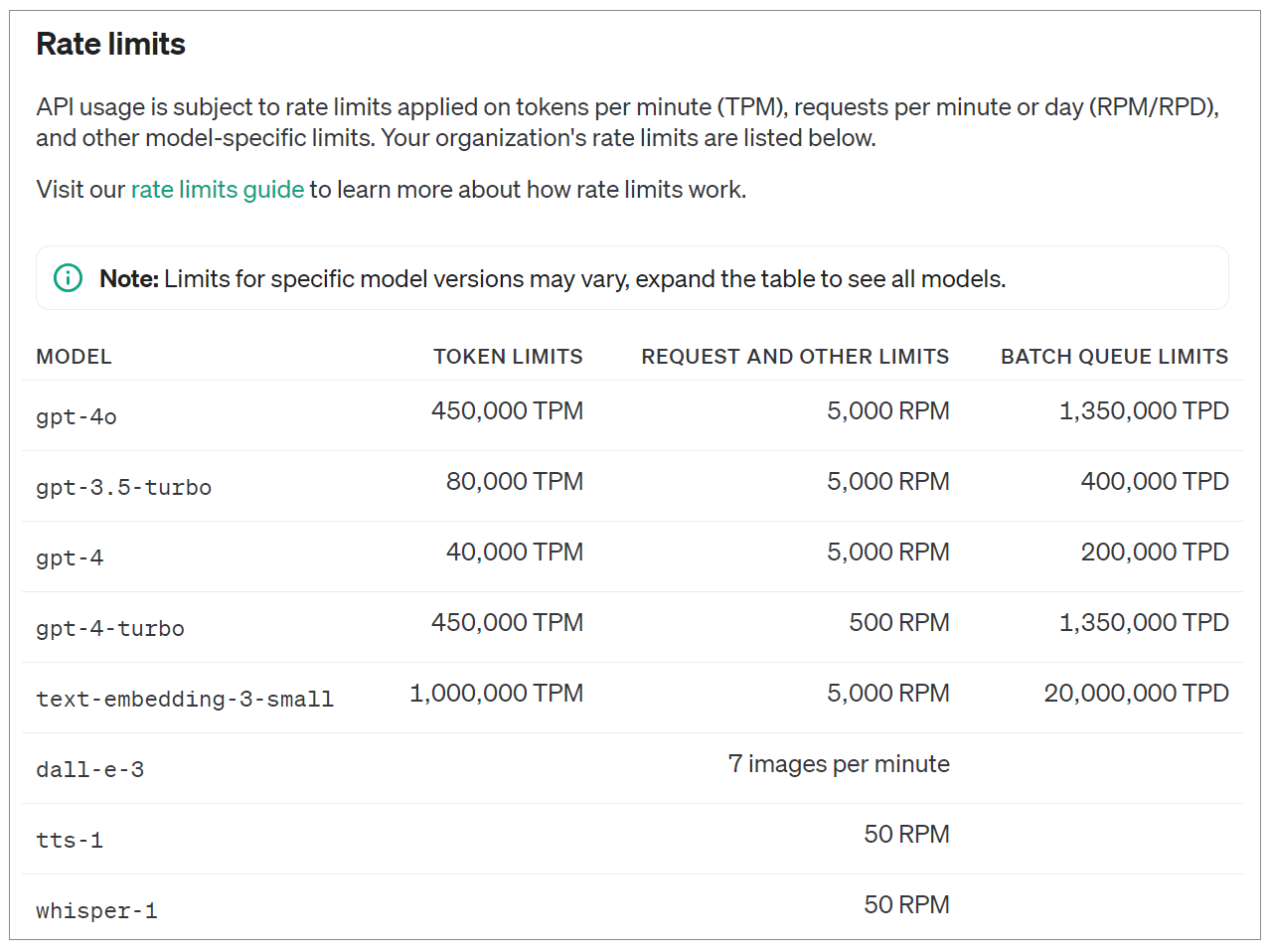 OpenAI的速率限制系统采用了多维度的限制策略。具体而言,限制包括每分钟请求数(RPM)、每天请求数(RPD)、每分钟Token数(TPM)、每天Token数(TPD)以及每分钟图像数(IPM)等。这些限制并不是独立运作的,而是相互关联的。例如,即使用户没有达到TPM限制,但如果超过了RPM限制,仍然会触发限制机制。这些限制是在组织和项目级别设置的,而不是针对单个用户。不同的模型可能有不同的限制标准,某些模型系列甚至可能共享相同的限制。
