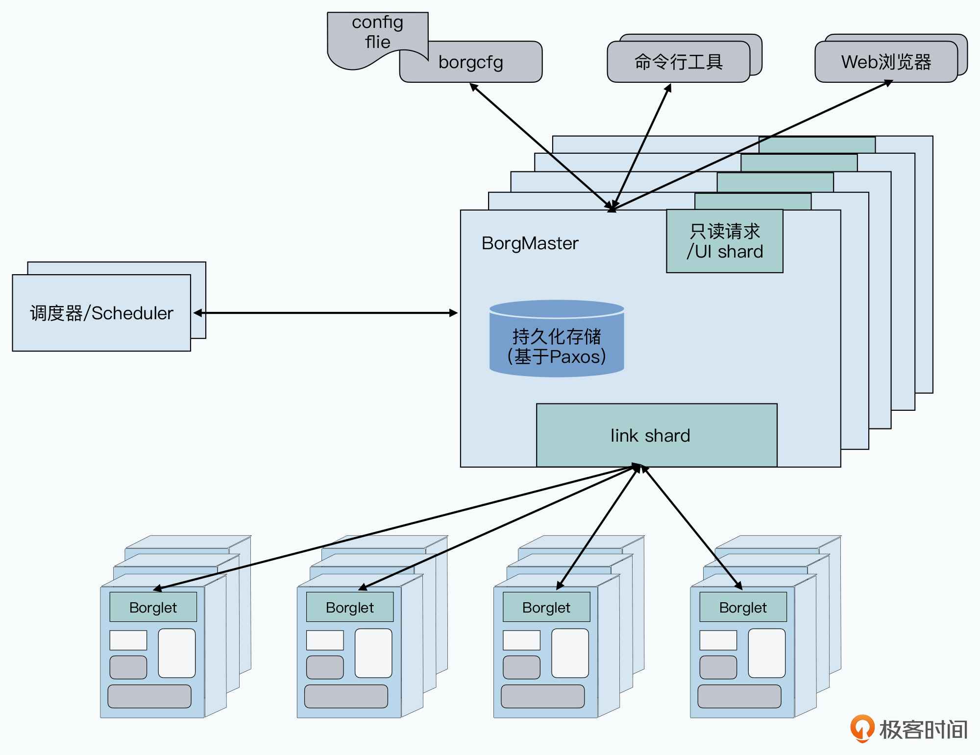 在有了CGroup之后,Borg系统的整体架构并不复杂,是一个典型的Master-Slave系统。它通过Paxos实现Master的高可用性和一致性,通过Borglet来管理每个服务器上的Tasks,而具体的Tasks,则不需要依赖Borg本身的Master和Borglet来执行。这一系列的设计,和我们之前看过的那么多的分布式系统,并没有本质上的区别。