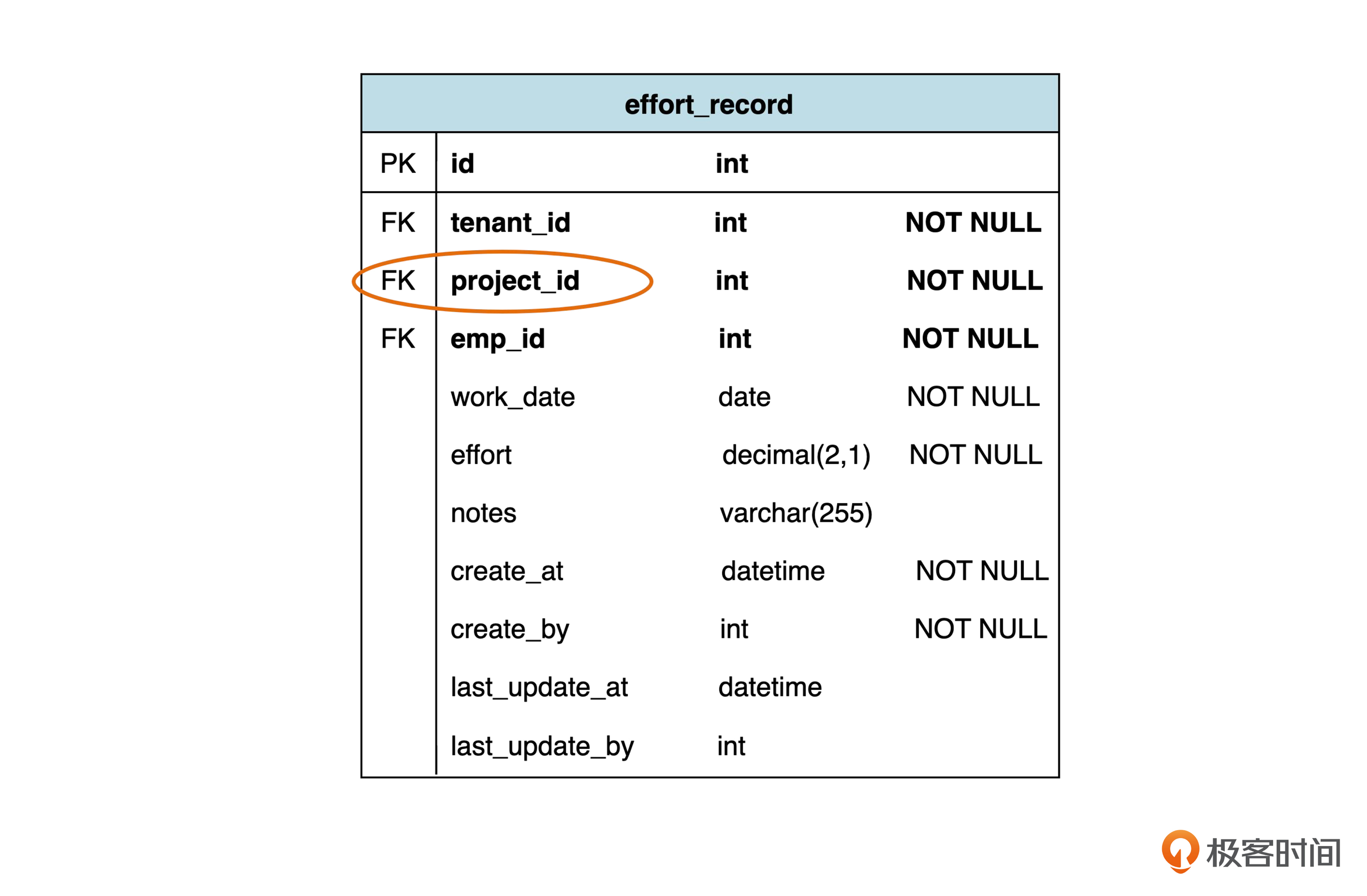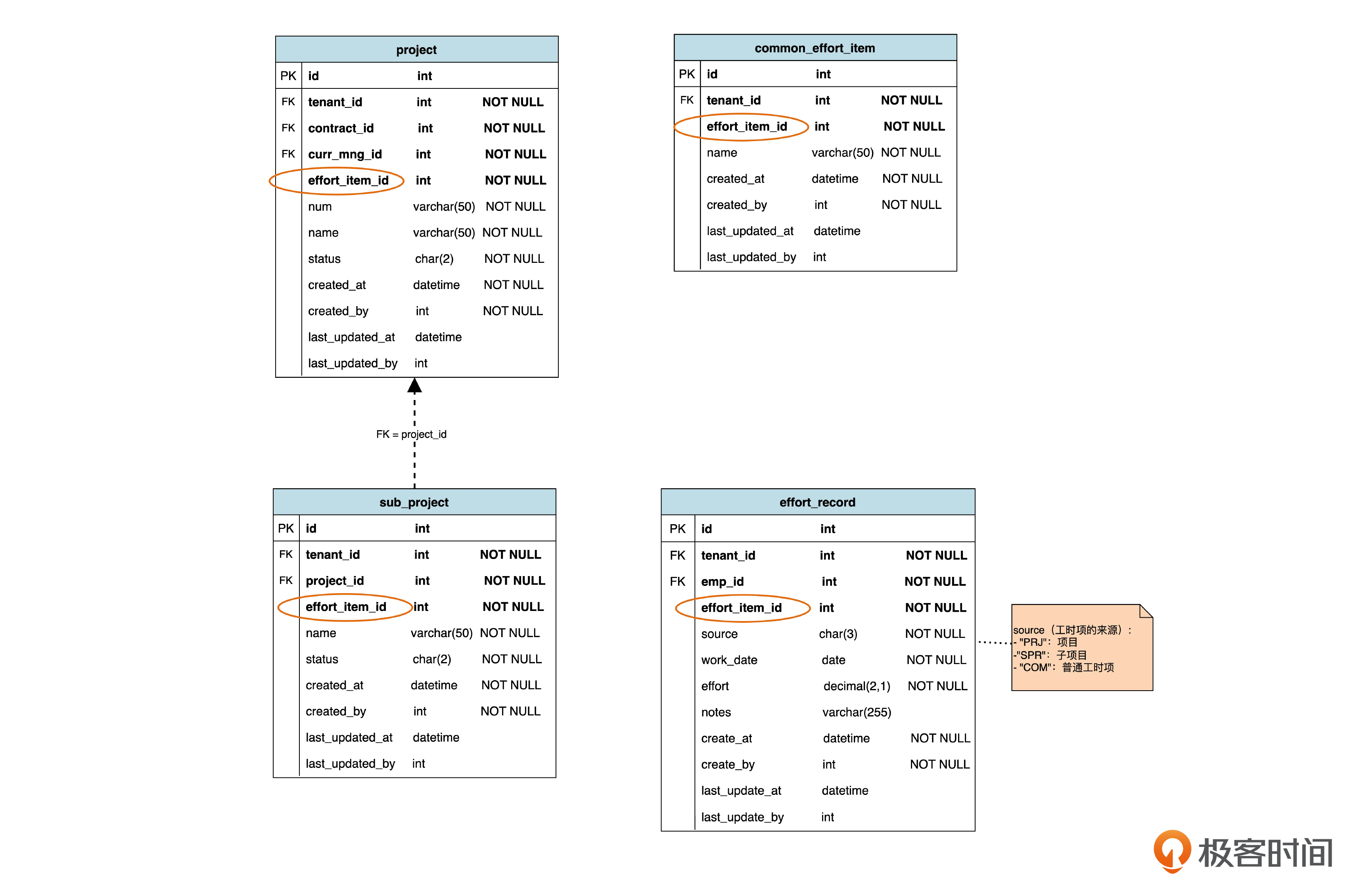 再看一下工时项记录(effort_record)表。回忆一下,在第一个迭代,这个表里有一个项目 ID(project_id),作为虚拟外键,指向项目表。