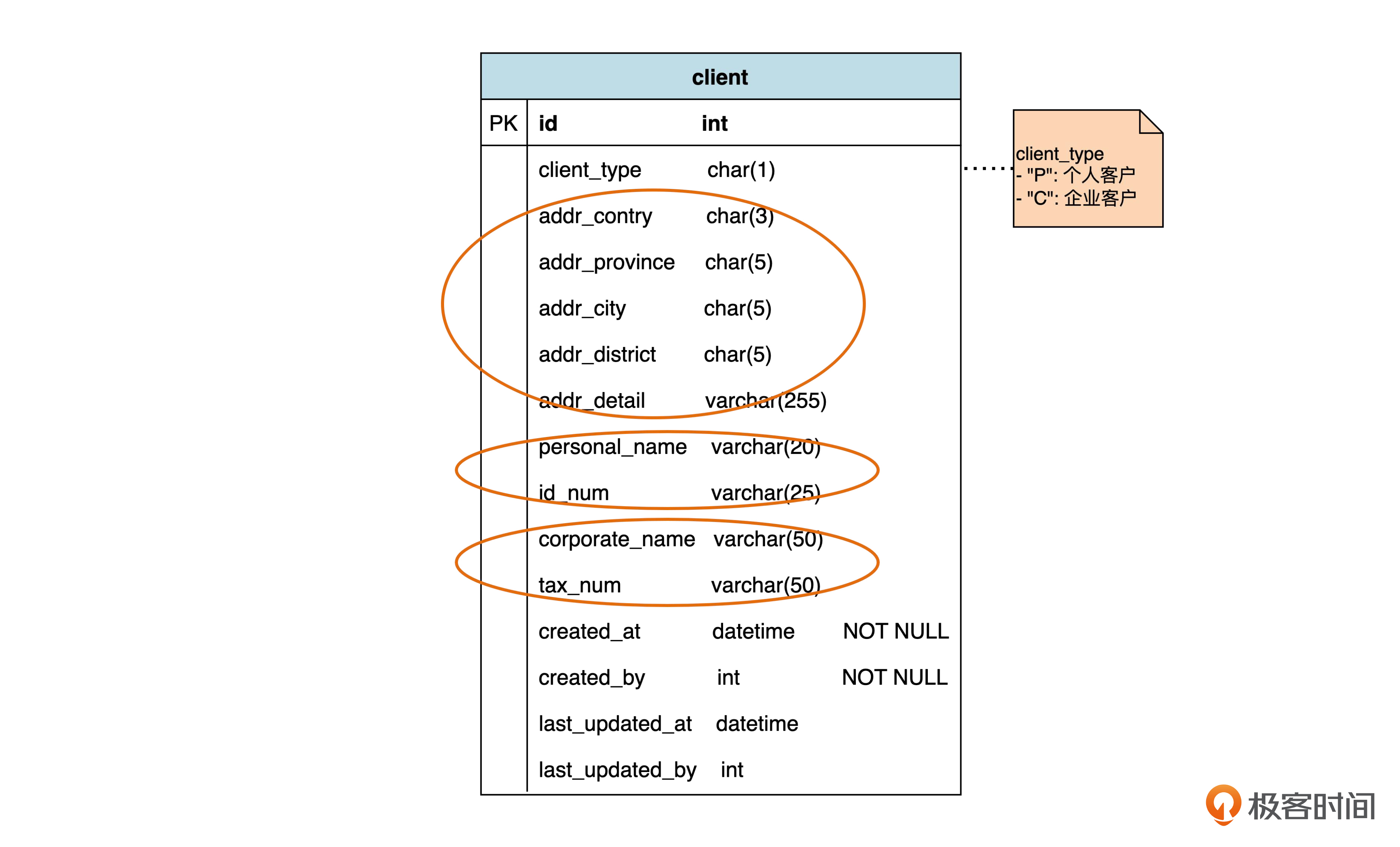 我们看到,这个表里包括公共属性,也就是地址相关的属性;个人客户独有的属性,也就是姓名和身份证号,以及企业客户独有的属性,包括企业名称和税务号。由于个人客户姓名和企业客户名称都在同一个表里,所以不能都命名为“name”了,要用 personal_name 和 corporate_name 区分开。另外,client_type(客户类型)也是需要的。