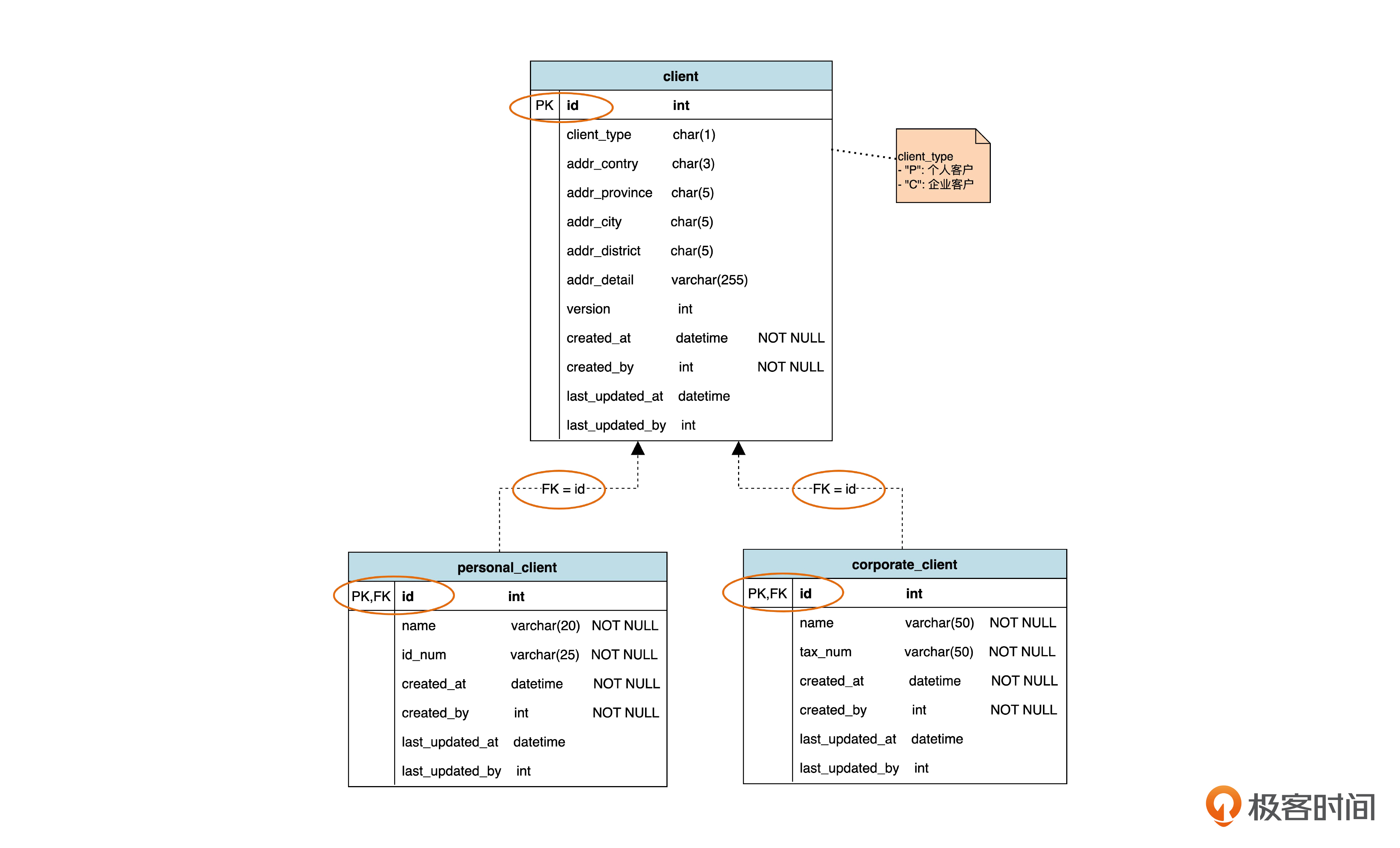 个人客户表和公司客户表自己有各自的主键,另外还有一个 client_id。这个 client_id 才是对应于父表中主键的外键。这时候,在子表里面,主键和外键是两个不同的字段,所以我们把这种策略称作“不共享主键”。