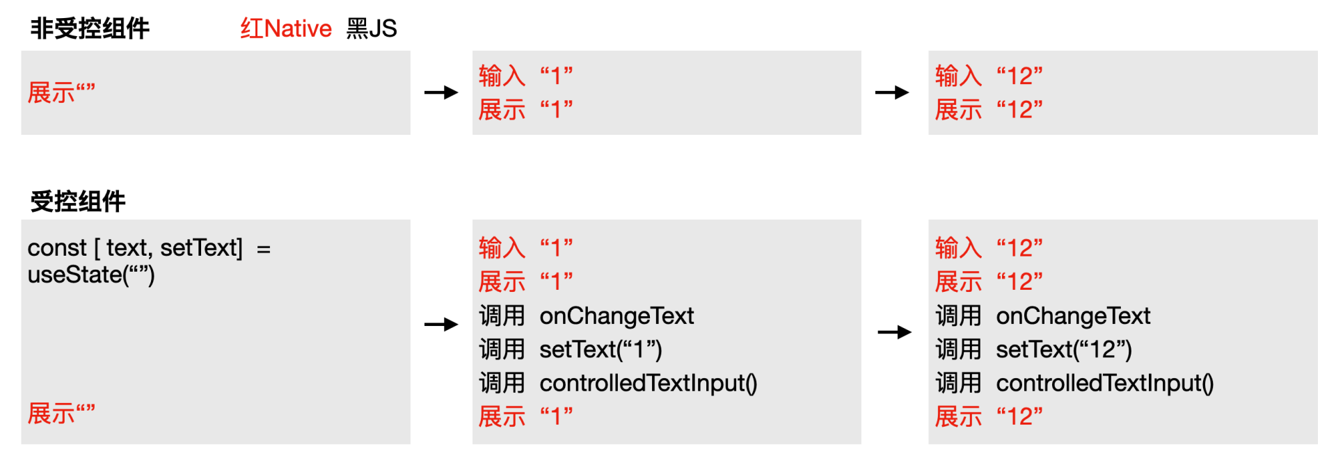也就是说,受控组件更新了两次展示的值,只是因为两次展示的值是一样的,用户看不出来而已。对于受控组件而言,即便存在系统或 Native 修改文本的情况,在 TextInput 的底层,也会将其强制更新为当前 TextInput 的 value 属性值。所以对于受控组件来说,输入框的文字始终是由 state 驱动的。