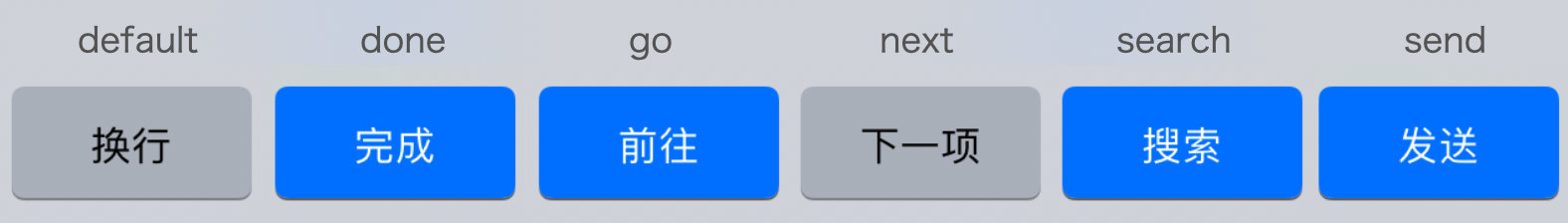 有两个属性可以设置这些文案,包括 iOS/Android 通用的 returnKeyType 和 Android 独有的 returnKeyLabel。全部的属性你可以查一下文档,我这里只说一下通用属性: