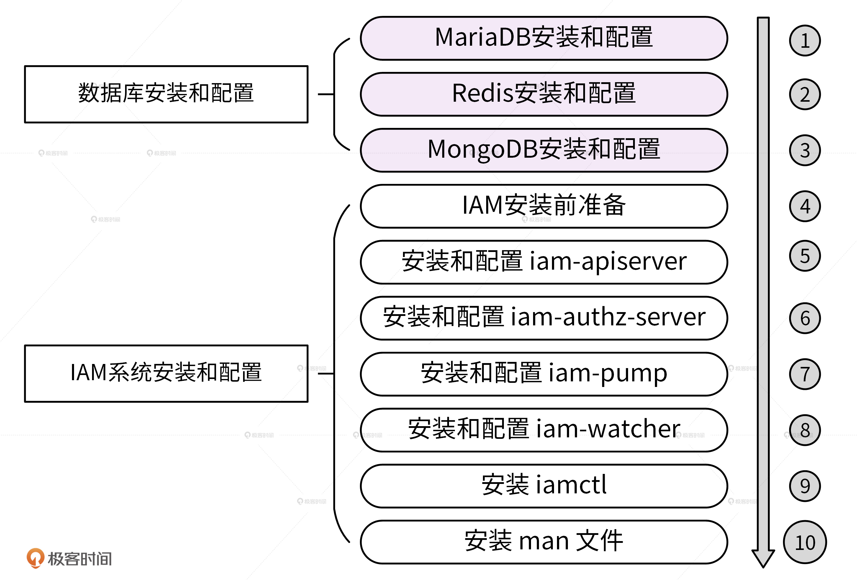 安装和配置数据库:我们需要安装和配置 MariaDB、Redis和MongoDB。 安装和配置 IAM 服务:我们需要安装和配置 iam-apiserver、iam-authz-server、iam-pump、iamctl和man 文件。 当然啦,如果你实在不想这么麻烦地去安装,我也在这一讲的最后给出了一键部署 IAM 系统的方法,但我还是希望你能按照我今天讲的详细步骤来操作。