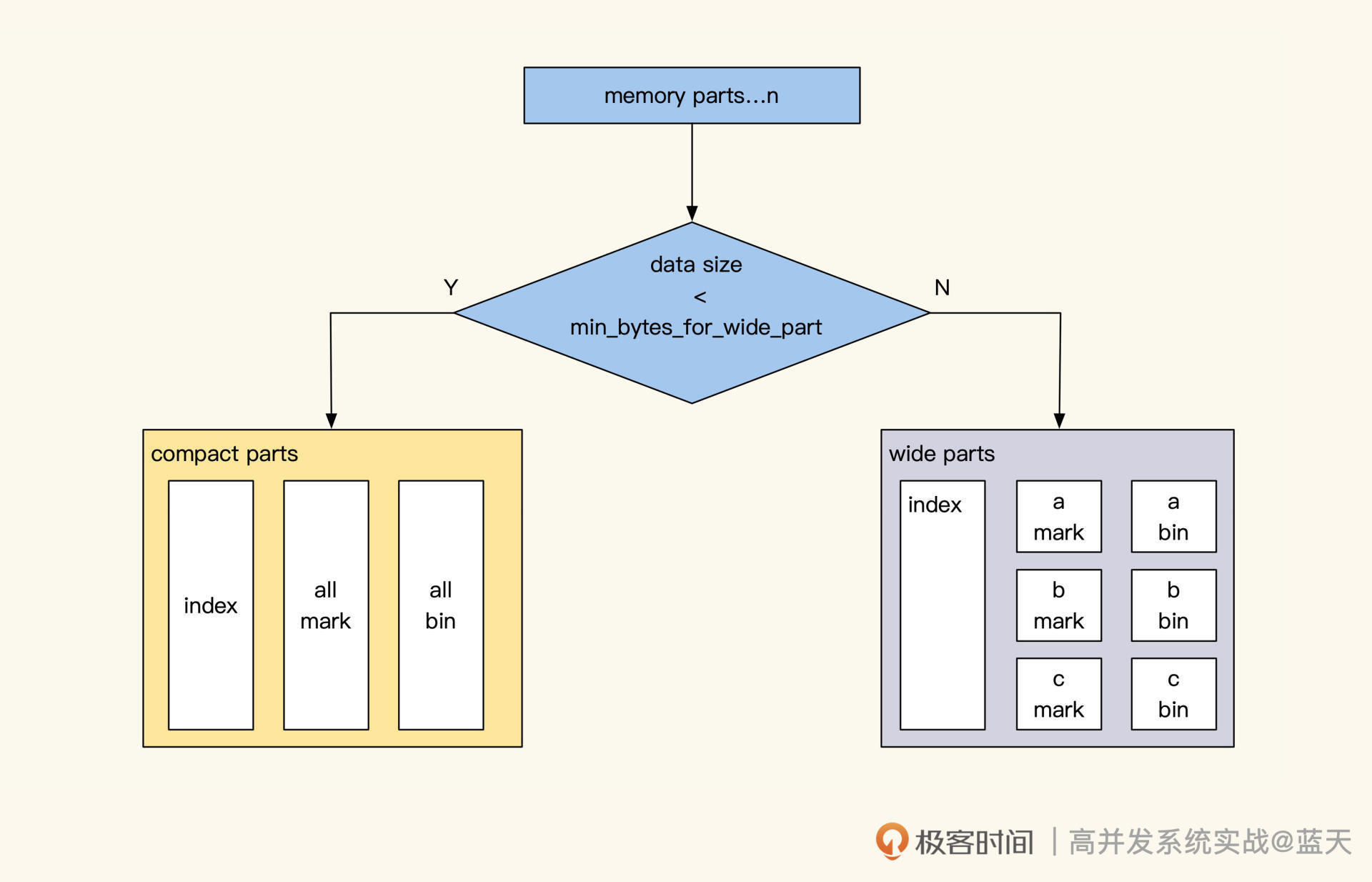 当我们大部分数据都是小数据的时候,一条数据拆分成多个列有一些浪费磁盘IO,因为是小量数据,我们也不会给他太多机器,这种情况推荐使用compact parts方式。当我们的数据列很大,需要对某几个列做数据统计分析时,wide part的列存储更有优势。