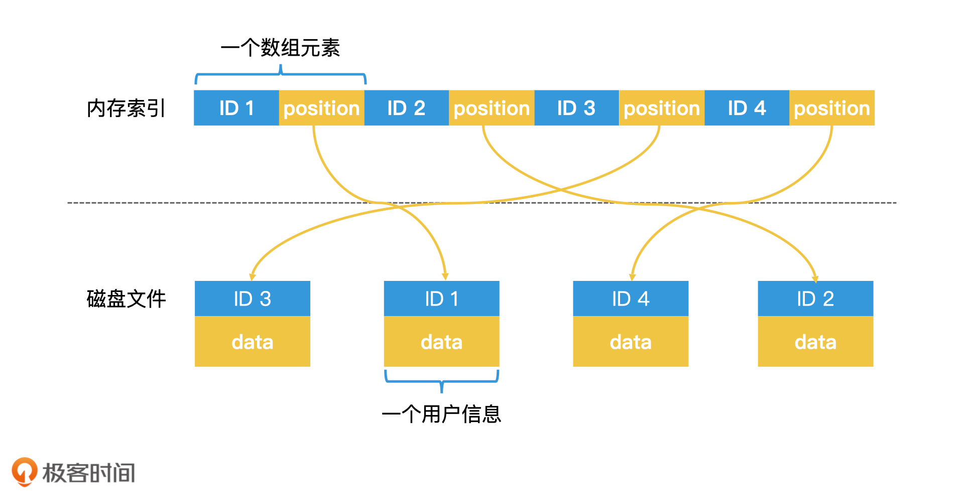 我们以查询用户信息为例。我们知道,一个系统中的用户信息非常多,除了有唯一标识的ID以外,还有名字、邮箱、手机、兴趣爱好以及文章列表等各种信息。一个保存了所有用户信息的数组往往非常大,无法全部放在内存中,因此我们会将它存储在磁盘中。