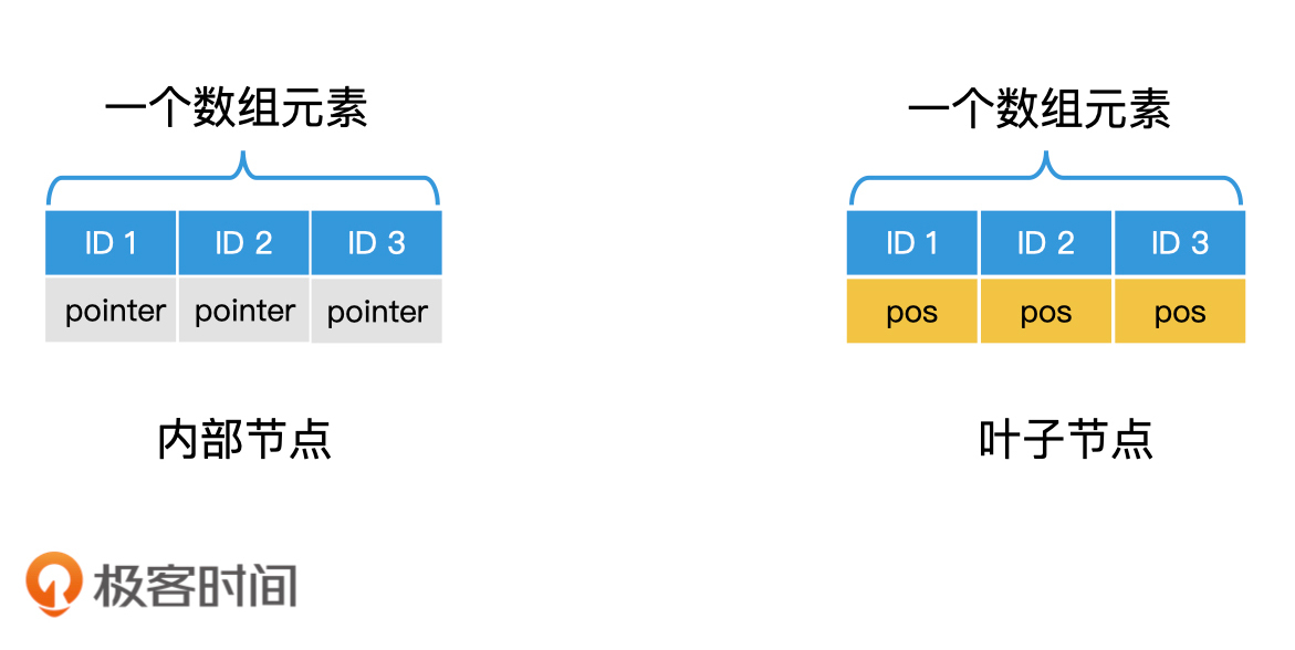 另外,这一节还有一个很重要的设计思想需要你掌握,那就是将索引和数据分离。通过这样的方式,我们能将索引的数组大小保持在一个较小的范围内,让它能加载在内存中。在许多大规模系统中,都是使用这个设计思想来精简索引的。而且,B+树的内部节点和叶子节点的区分,其实也是索引和数据分离的一次实践。