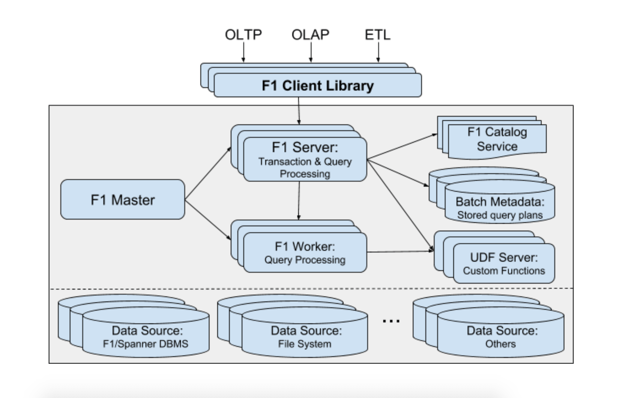 F1的新论文是“F1 Query: Declarative Querying at Scale”。这一版论文中F1不再强调和Spanner的绑定关系,而是支持更多的底层存储。非常有意思的是,F1也声称自己可以兼顾OLTP和OLAP。
