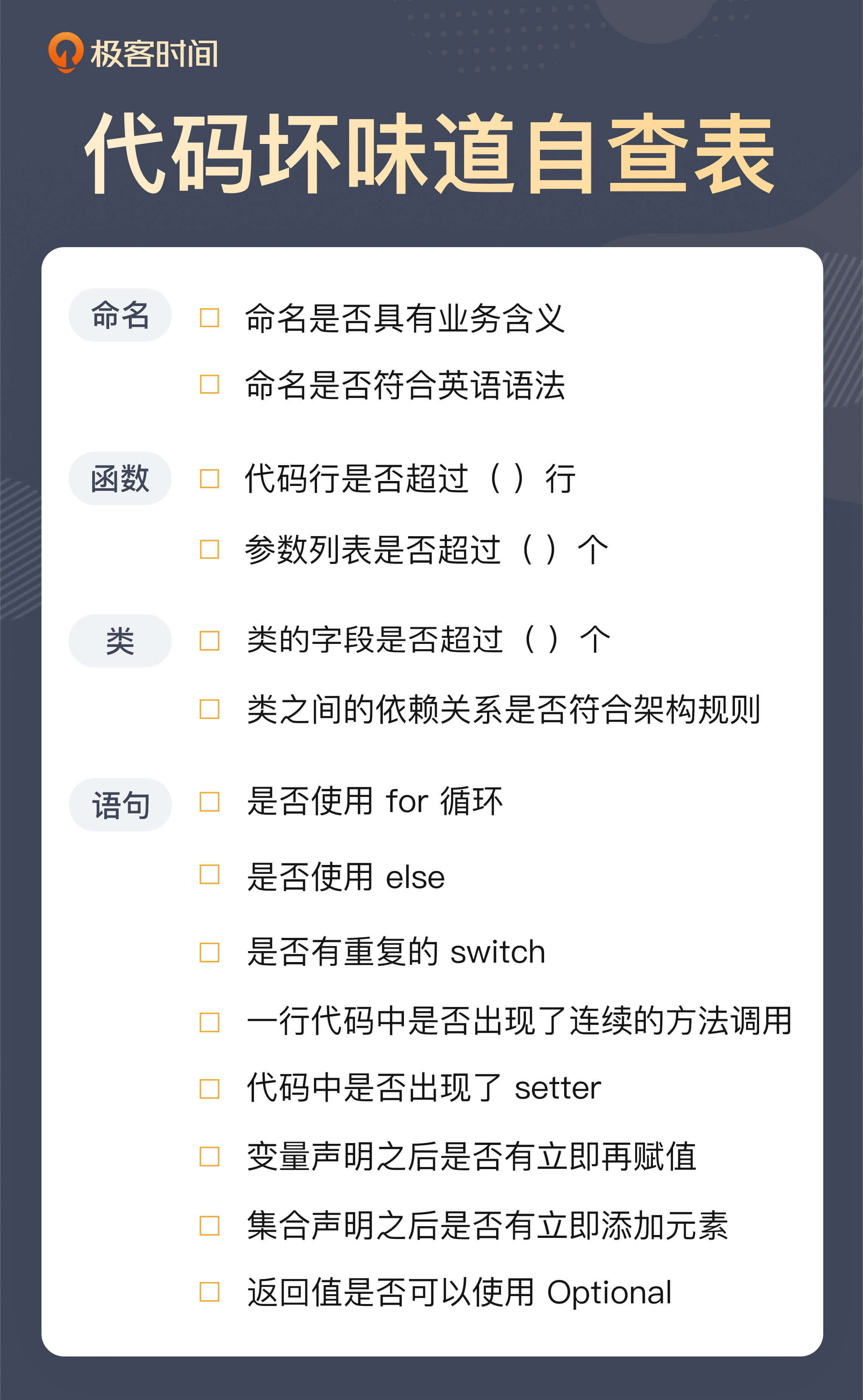 这里我也整理了一份“坏味道自查表”,把一些明显的“坏味道”信号列了出来,你可以和自己的代码做对比。