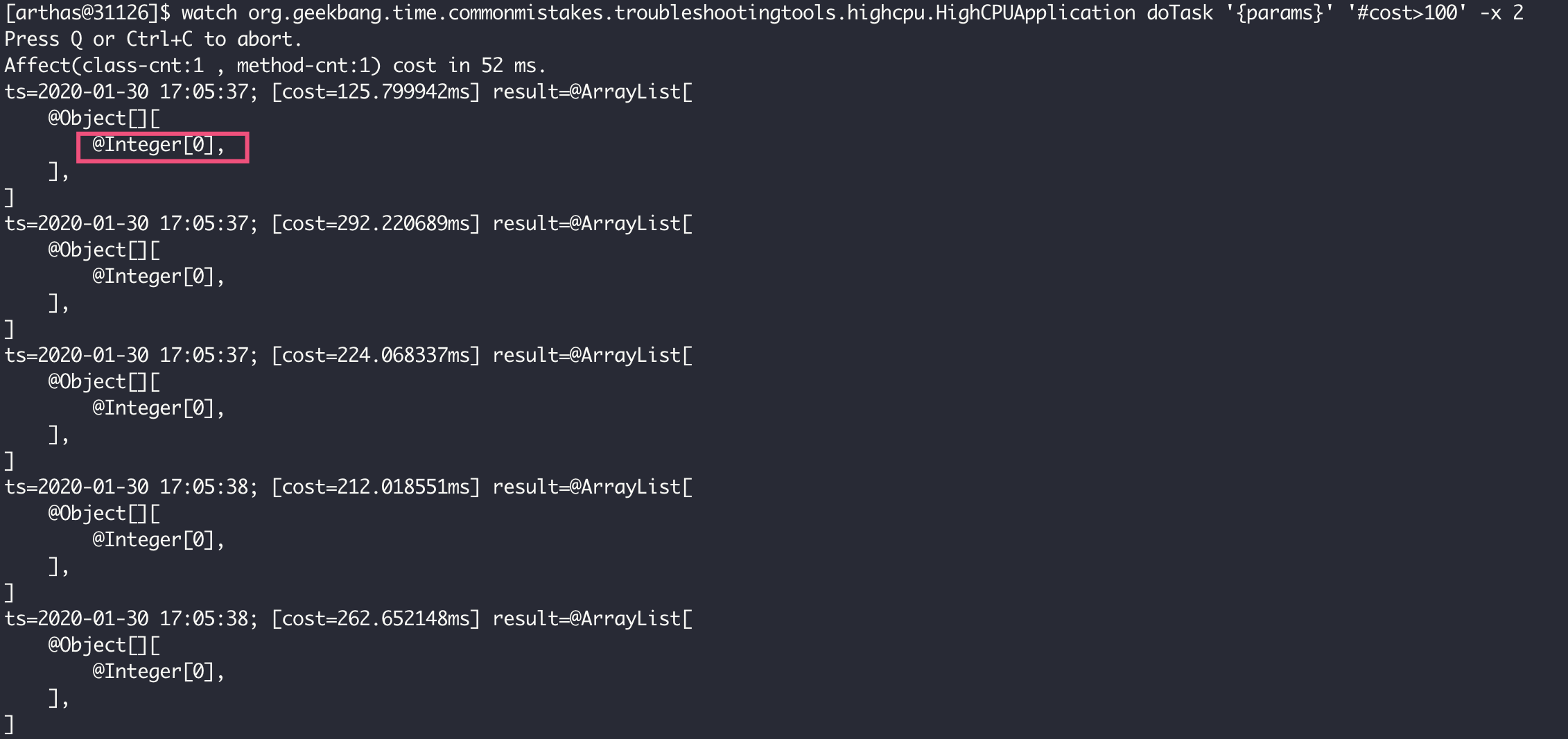 1 | watch org.geekbang.time.commonmistakes.troubleshootingtools.highcpu.HighCPUApplication doTask '{params}' '#cost>100' -x 2 |