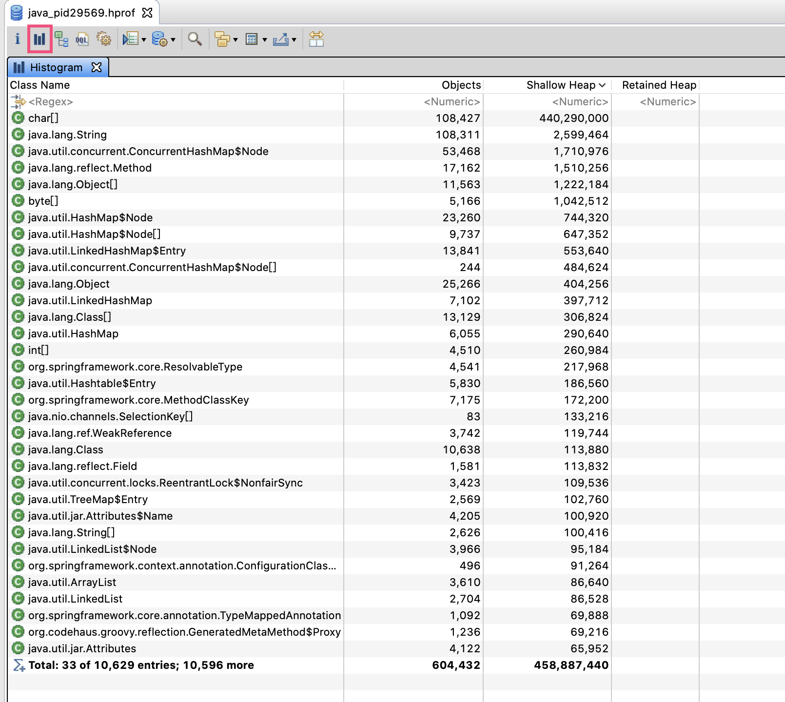如图所示,工具栏的第二个按钮可以打开直方图,直方图按照类型进行分组,列出了每个类有多少个实例,以及占用的内存。可以看到,char[]字节数组占用内存最多,对象数量也很多,结合第二位的String类型对象数量也很多,大概可以猜出(String使用char[]作为实际数据存储)程序可能是被字符串占满了内存,导致OOM。