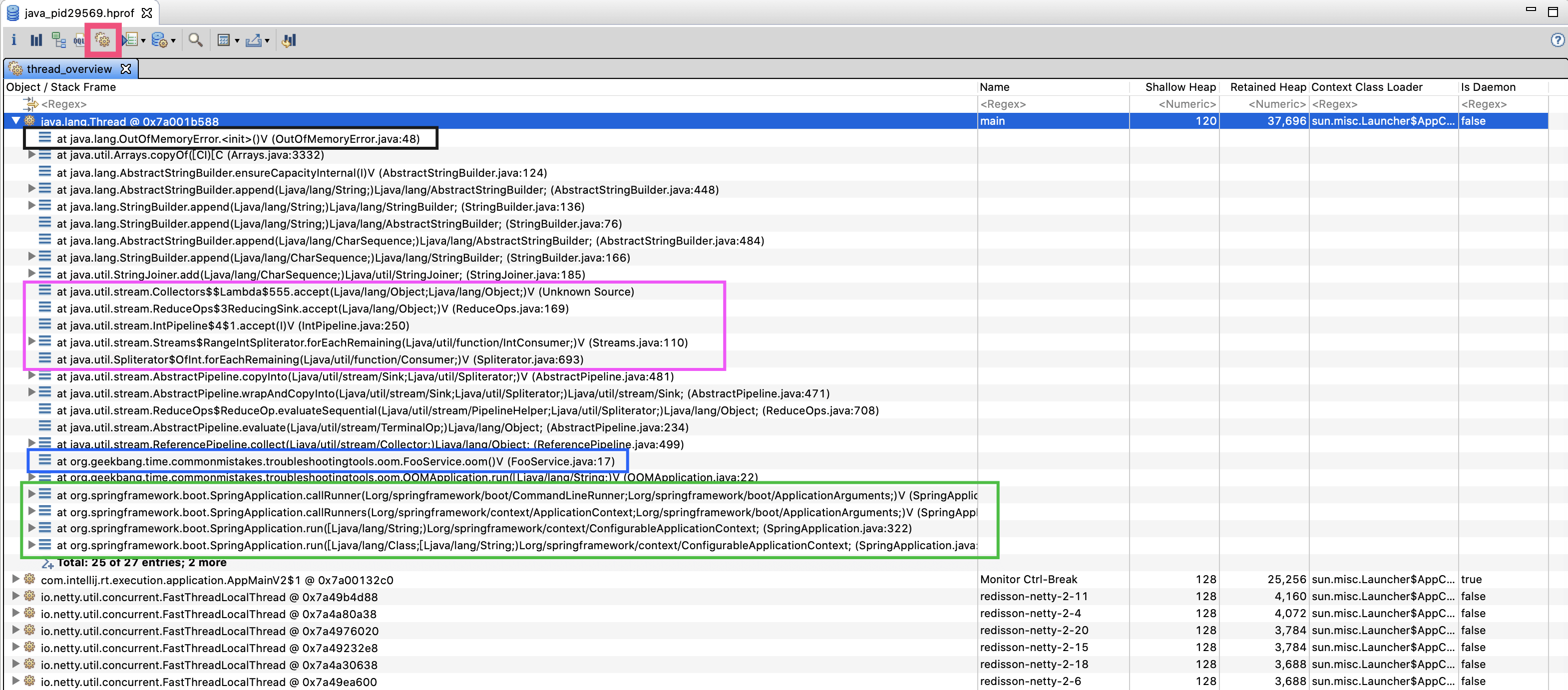 以FooService为起点往上看,从紫色框中的Collectors和IntPipeline,你大概也可以猜出,这些字符串是由Stream操作产生的。再往上看,可以发现在StringBuilder的append操作的时候,出现了OutOfMemoryError异常(黑色框部分),说明这这个线程抛出了OOM异常。