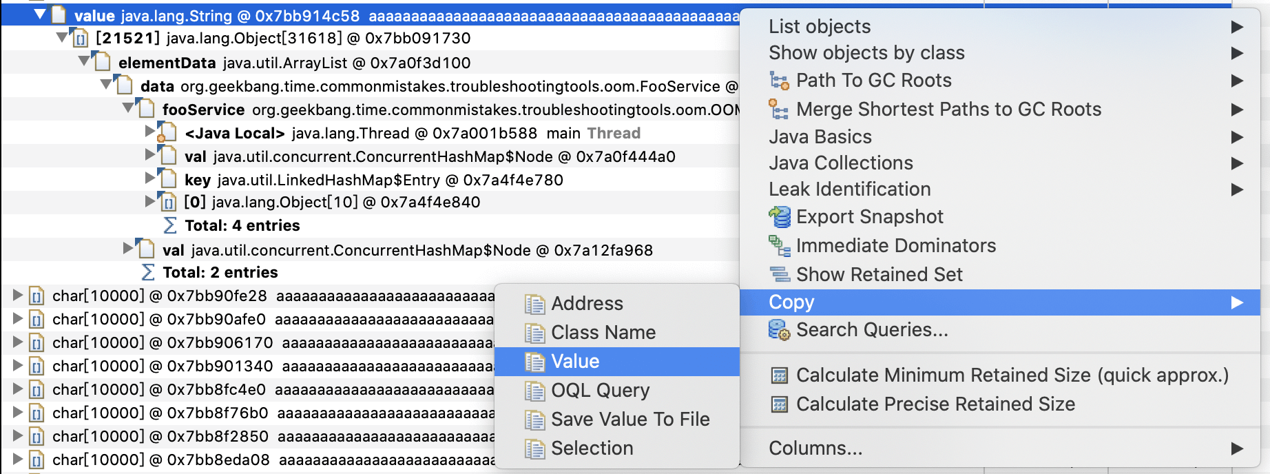 可以看到,第一位就是FooService,整个路径是FooSerice->ArrayList->Object[]->String->char[](蓝色框部分),一共有21523个字符串(绿色方框部分):