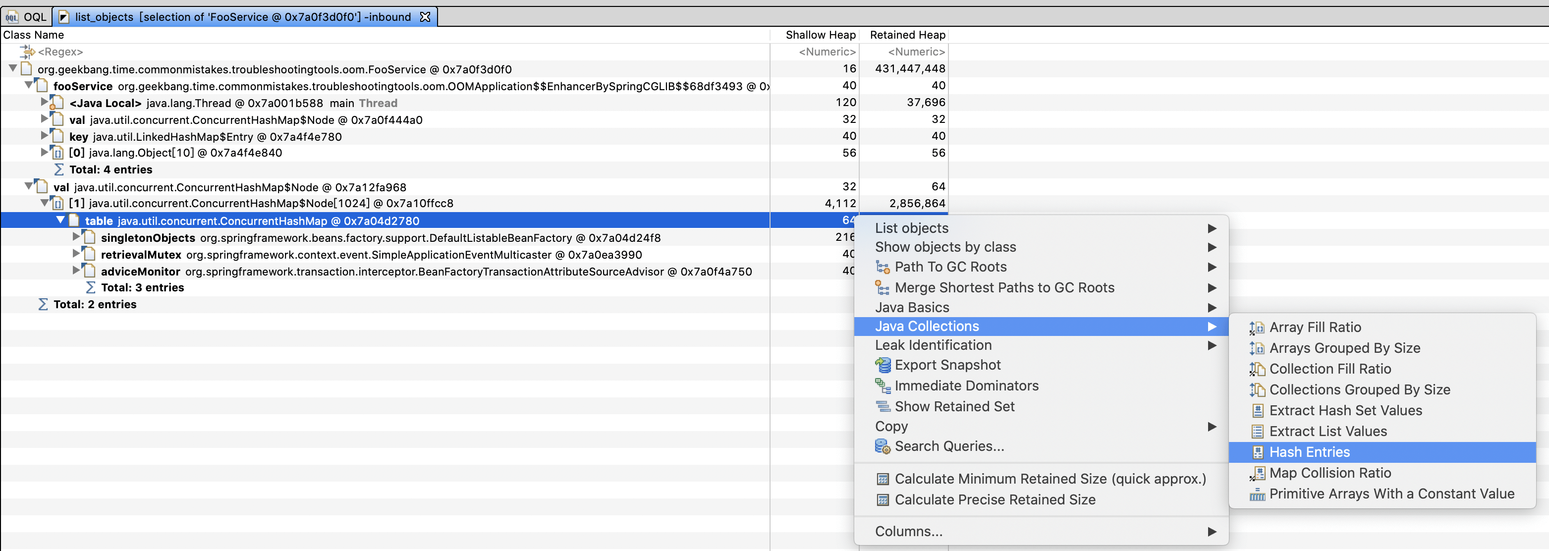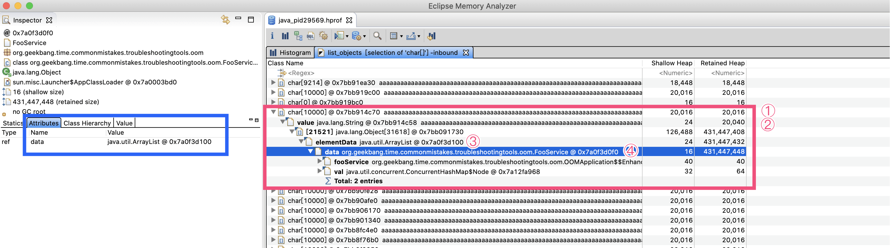 Retained Heap(深堆)代表对象本身和对象关联的对象占用的内存,Shallow Heap(浅堆)代表对象本身占用的内存。比如,我们的FooService中的data这个ArrayList对象本身只有16字节,但是其所有关联的对象占用了431MB内存。这些就可以说明,肯定有哪里在不断向这个List中添加String数据,导致了OOM。