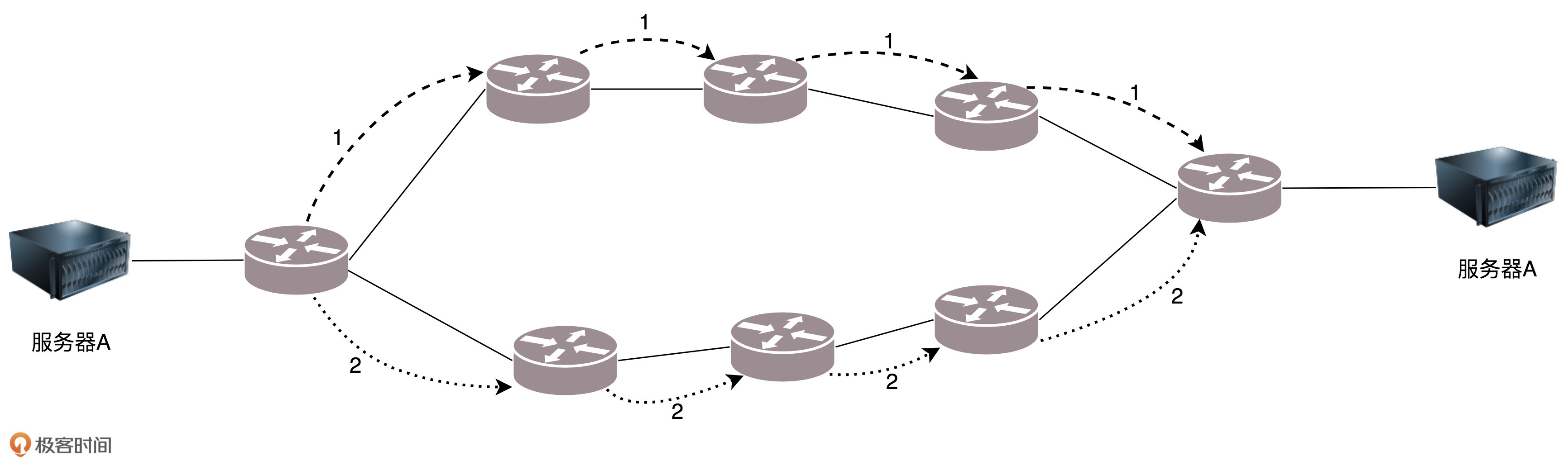 内部网关协议的重点就是找到最短的路径。在一个组织内部,路径最短往往最优。当然有时候OSPF可以发现多个最短的路径,可以在这多个路径中进行负载均衡,这常常被称为等价路由。