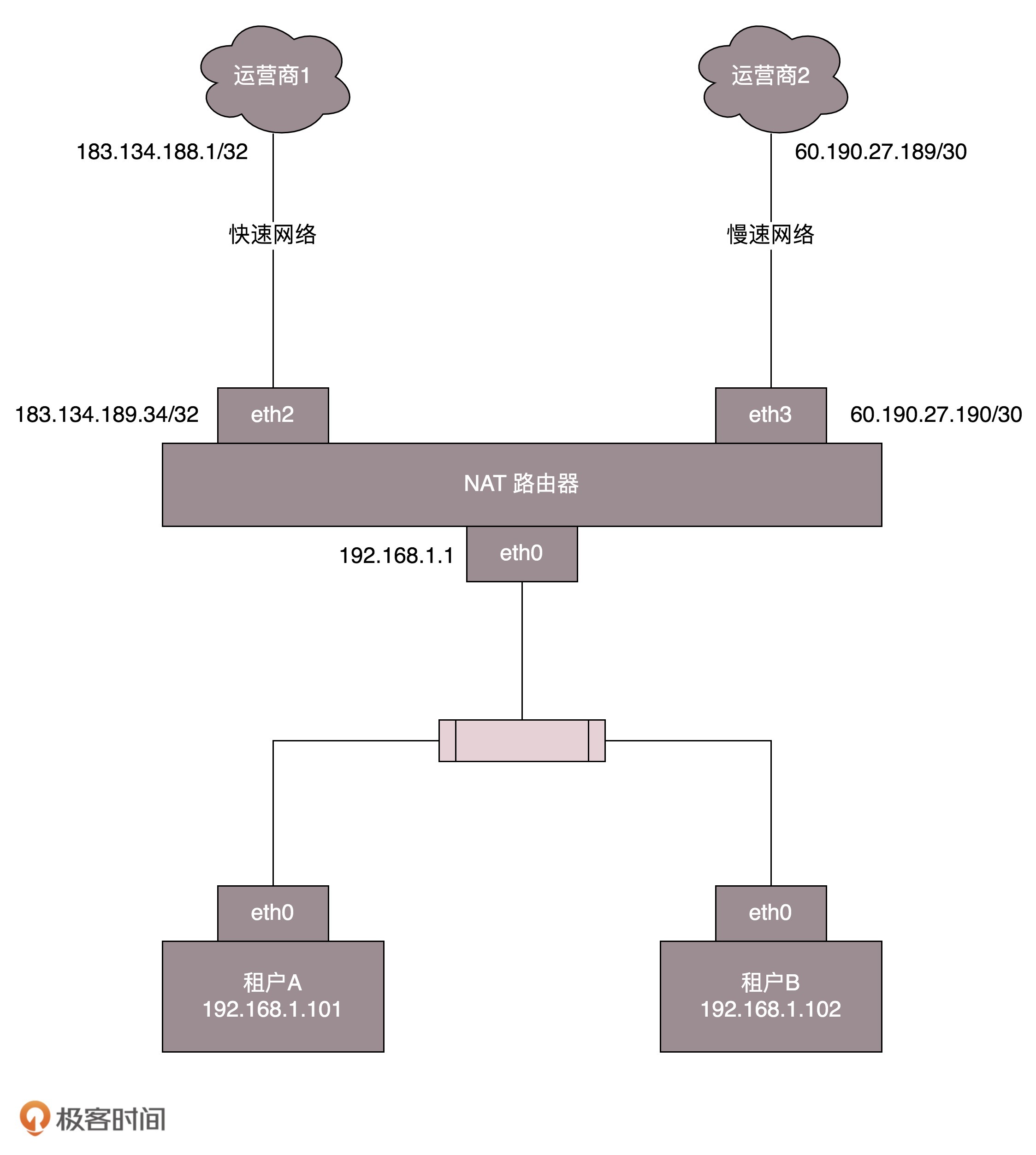 例如,运营商1给路由器分配的地址是183.134.189.34/32,而运营商网络里面的网关是183.134.188.1/32。有的是/30的,也就是分了一个特别小的网段。运营商2给路由器分配的地址是60.190.27.190/30,运营商网络里面的网关是60.190.27.189/30。