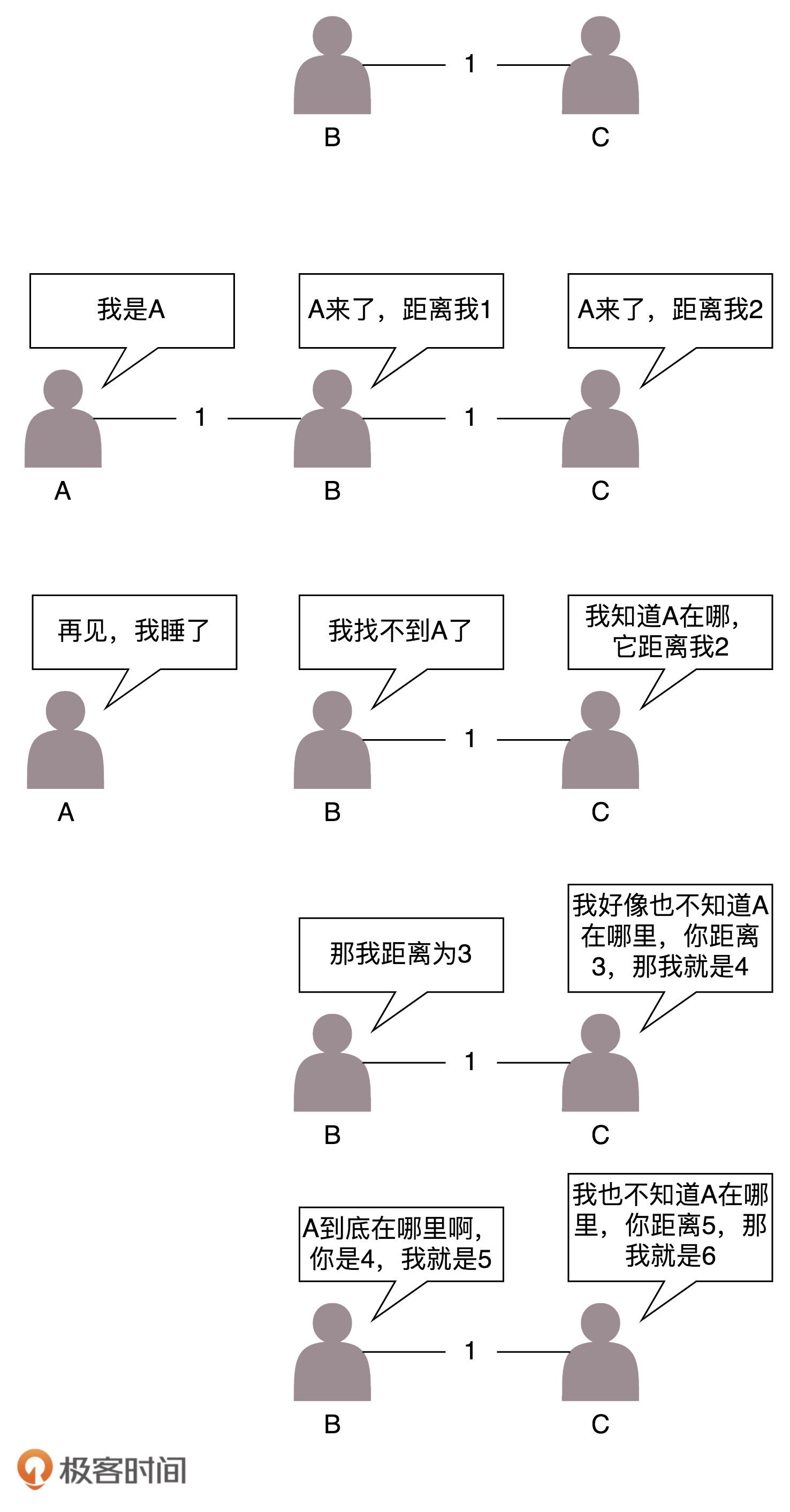 原来的网络包括两个节点,B和C。A加入了网络,它的邻居B很快就发现A启动起来了。于是它将自己和A的距离设为1,同样C也发现A起来了,将自己和A的距离设置为2。但是如果A挂掉,情况就不妙了。B本来和A是邻居,发现连不上A了,但是C还是能够连上,只不过距离远了点,是2,于是将自己的距离设置为3。殊不知C的距离2其实是基于原来自己的距离为1计算出来的。C发现自己也连不上A,并且发现B设置为3,于是自己改成距离4。依次类推,数越来越大,直到超过一个阈值,我们才能判定A真的挂了。