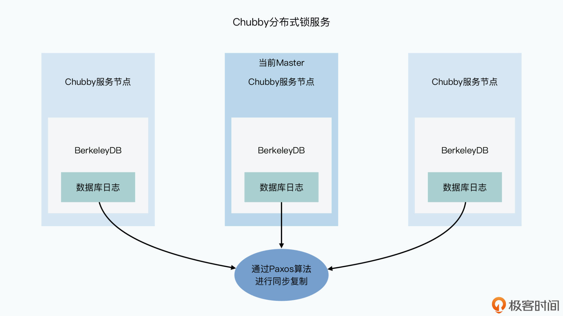 其实,解决这两个问题的答案,就是Chubby,也就是Paxos算法。Chubby具体的技术实现并不简单,但是思路却非常简单。那就是,我们的“共识”并不需要在每一个操作、每一条日志写入的时候发生,我们只需要有一个“共识”,确认哪一个是Master就好了。