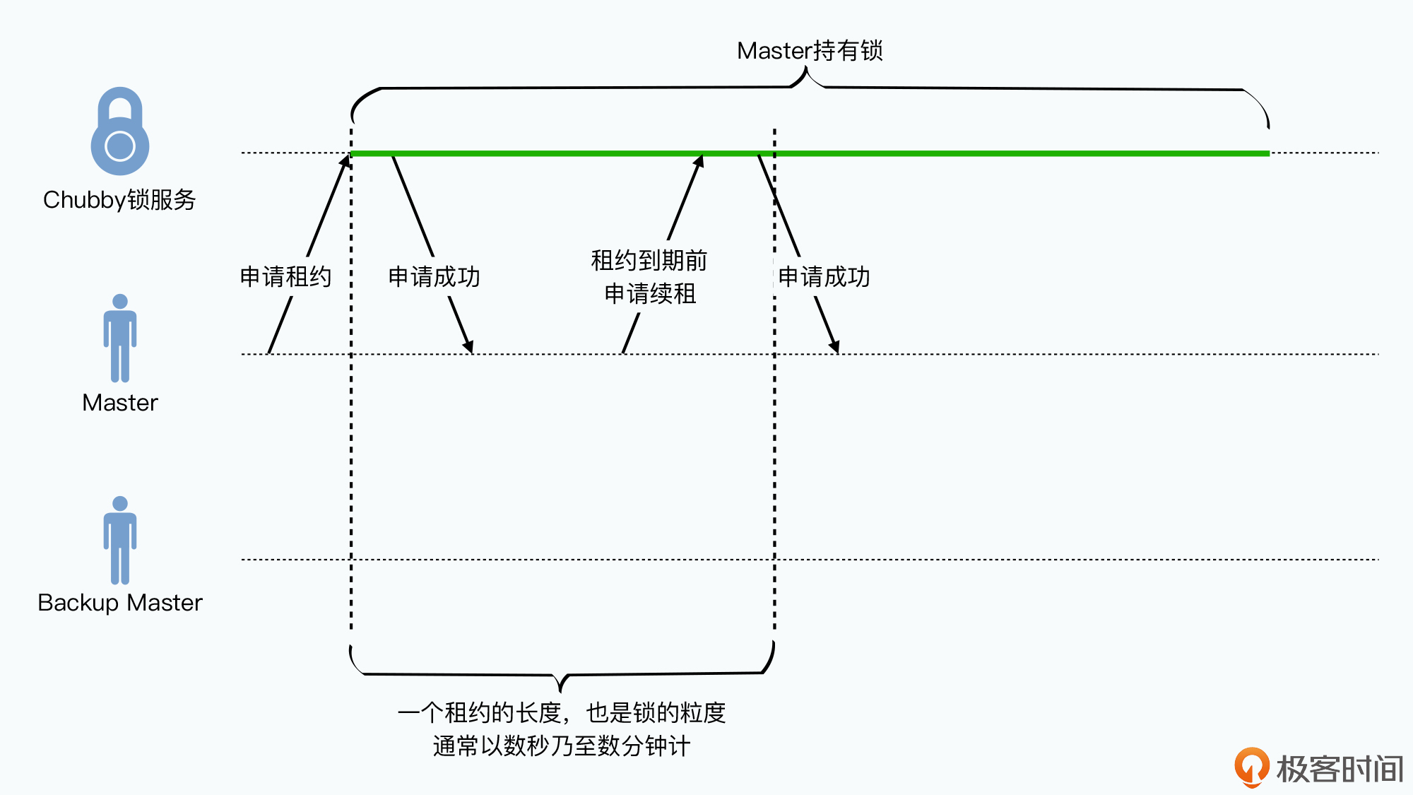 而如果等一会儿还是没有过来,那么Chubby就会再把锁释放掉。这个就好像你在现实生活中租房子,租约要到期了,如果你是主动和房东说你不再续租了,房东自然可以立刻租给别人。但是可能你因为出差或者疫情隔离,没有来得及和房东沟通,房东也会善意地多等你几天,直到一段时间之后你还是失去联系了,才再会去租给别人。