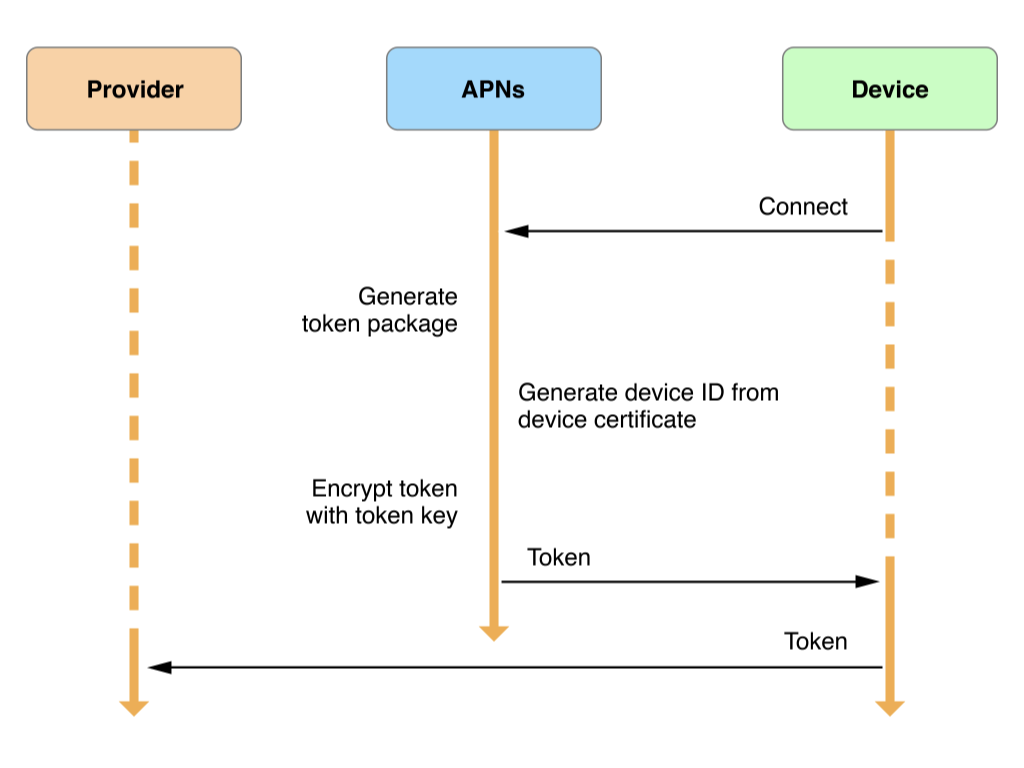 每当我们有消息需要推送时,都必须连同消息,再携带待接收系统设备的DeviceToken给到APNs。APNs通过这个DeviceToken,就能找到对应的连接设备,从而就可以把消息通过APNs和设备间的长连接,推送给这台设备上的App了。具体的流程你可以参考下面这张官网图。