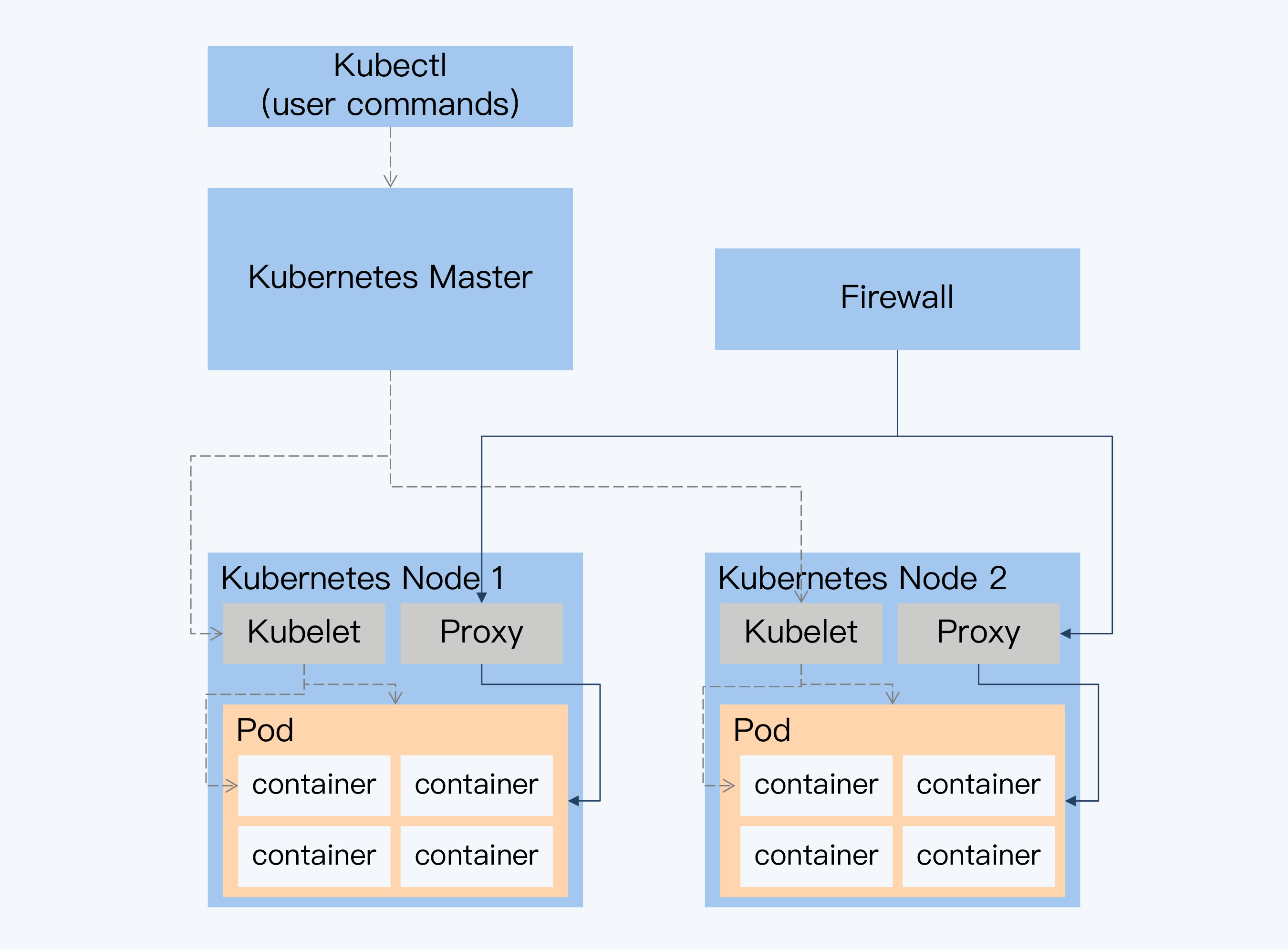 总体上,Kubernetes是一个主从结构(Master-Slave)。其中Master是一个控制面板,每个Salve就是物理节点上代理Kubelet,Master与Kubelet通讯完成对物理节点上Pod和Container的管理。外部网络可以直接通过节点上的Proxy,调用容器中的服务,不需要经过Master。