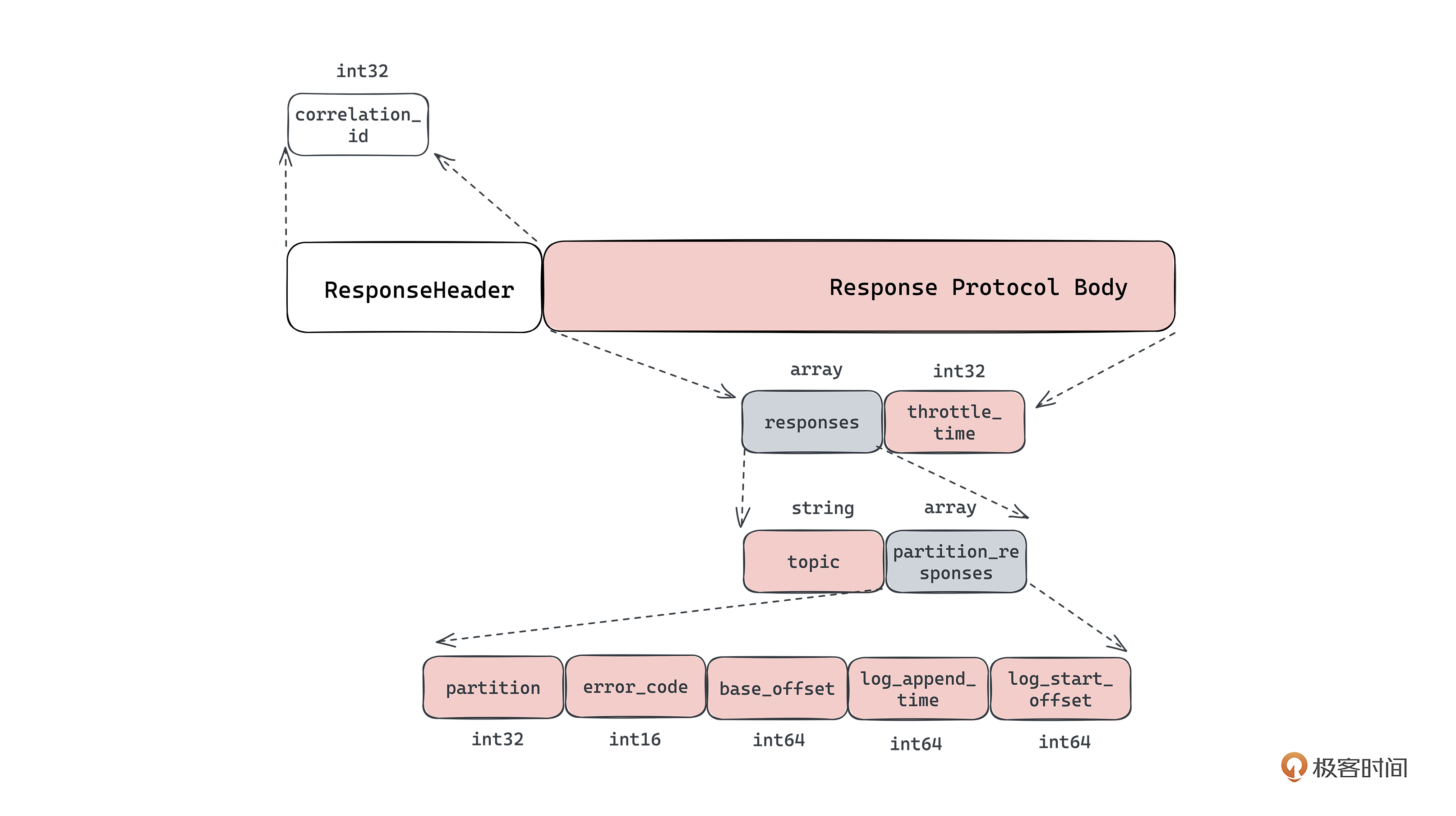 同样为了让你直观感受协议体的设计,我们看Kafka生产请求和返回的协议内容,你可以先自己分析一下。
