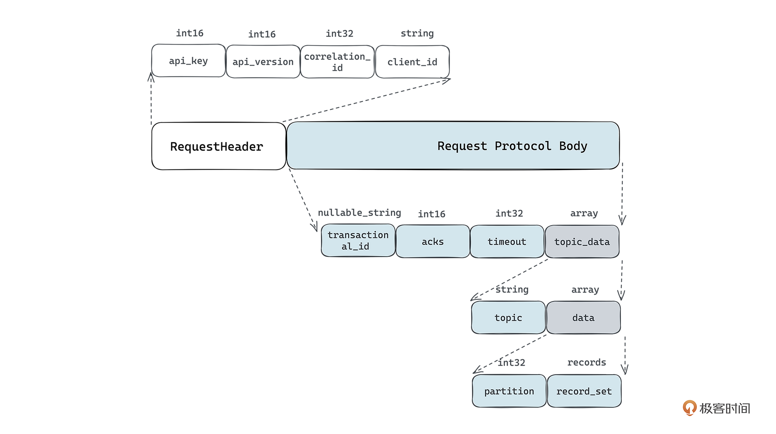 设计的原则是:请求维度的通用信息放在协议头,消息维度的信息就放在协议体。那具体怎么设计呢?我们结合Kafka协议来分析。