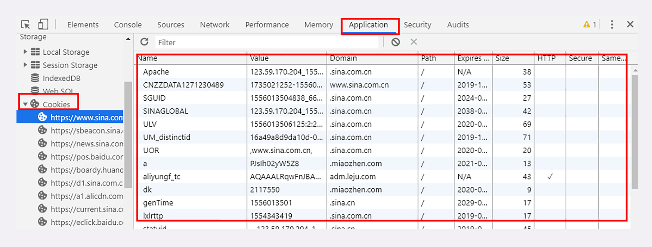 Chrome开发者工具是查看Cookie的有力工具,在“Network-Cookies”里可以看到单个页面Cookie的各种属性,另一个“Application”面板里则能够方便地看到全站的所有Cookie。