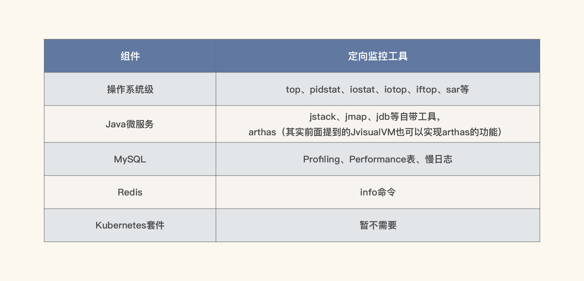 因此,对应的监控工具如下表所示。