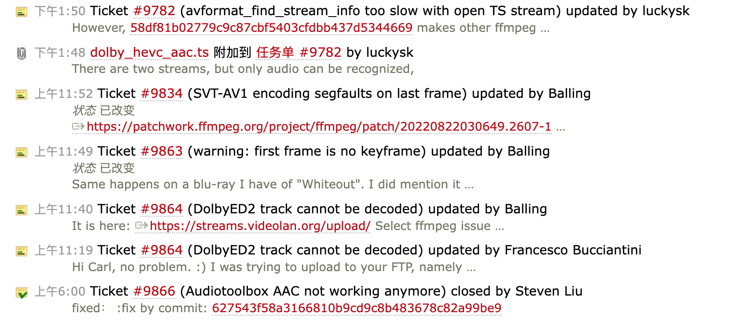 FFmpeg的维护不是在GitHub上面,所以Bug反馈在GitHub上面找不到issue,FFmpeg是通过trac来管理Bug的。Bug也分很多种,有需求类Bug,也有阻塞型Bug。提Bug的格式也需要注意,主要是需要说清楚自己的环境、FFmpeg的版本和使用的参数,把FFmpeg执行命令的那一行到结束的所有的内容都贴到Bug说明里,不需要自己做内容剪切。不然,开发者们可能无法理解你的Bug诉求。