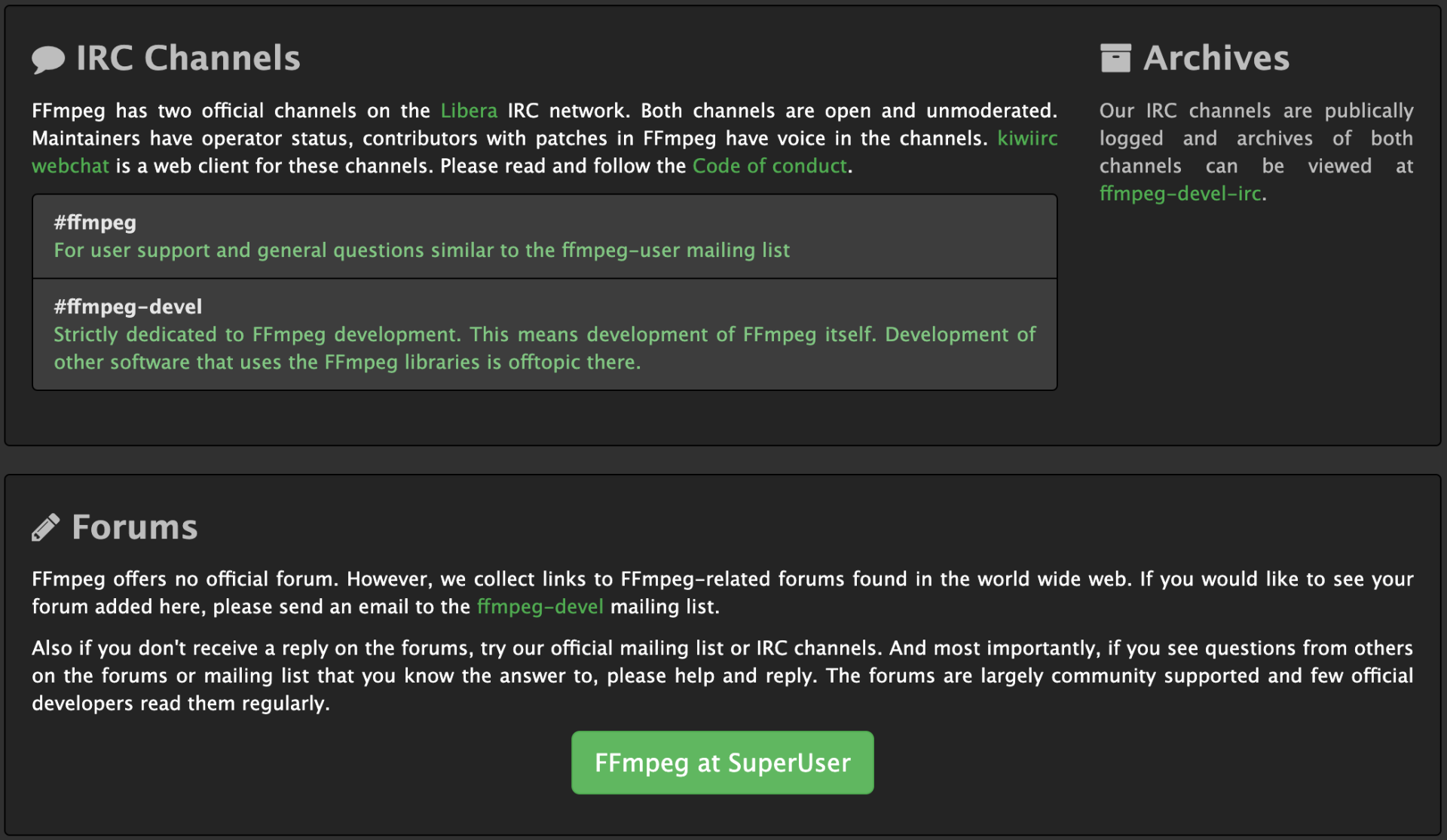 聊天室主要是分为用户聊天室和开发者聊天室,用户主要是命令行用户和API用户,开发者是指FFmpeg内部代码开发者。用户聊天室人会多一些,活跃度高一些,开发者聊天室用户少,所以活跃度没有那么高,并且大多是关于开发内容的临时性沟通,主要沟通还是在邮件列表里面,所以通常大家不怎么用IRC交流,除非特别着急的时候。如果你有兴趣的话,可以看一下IRC相关的参考链接。