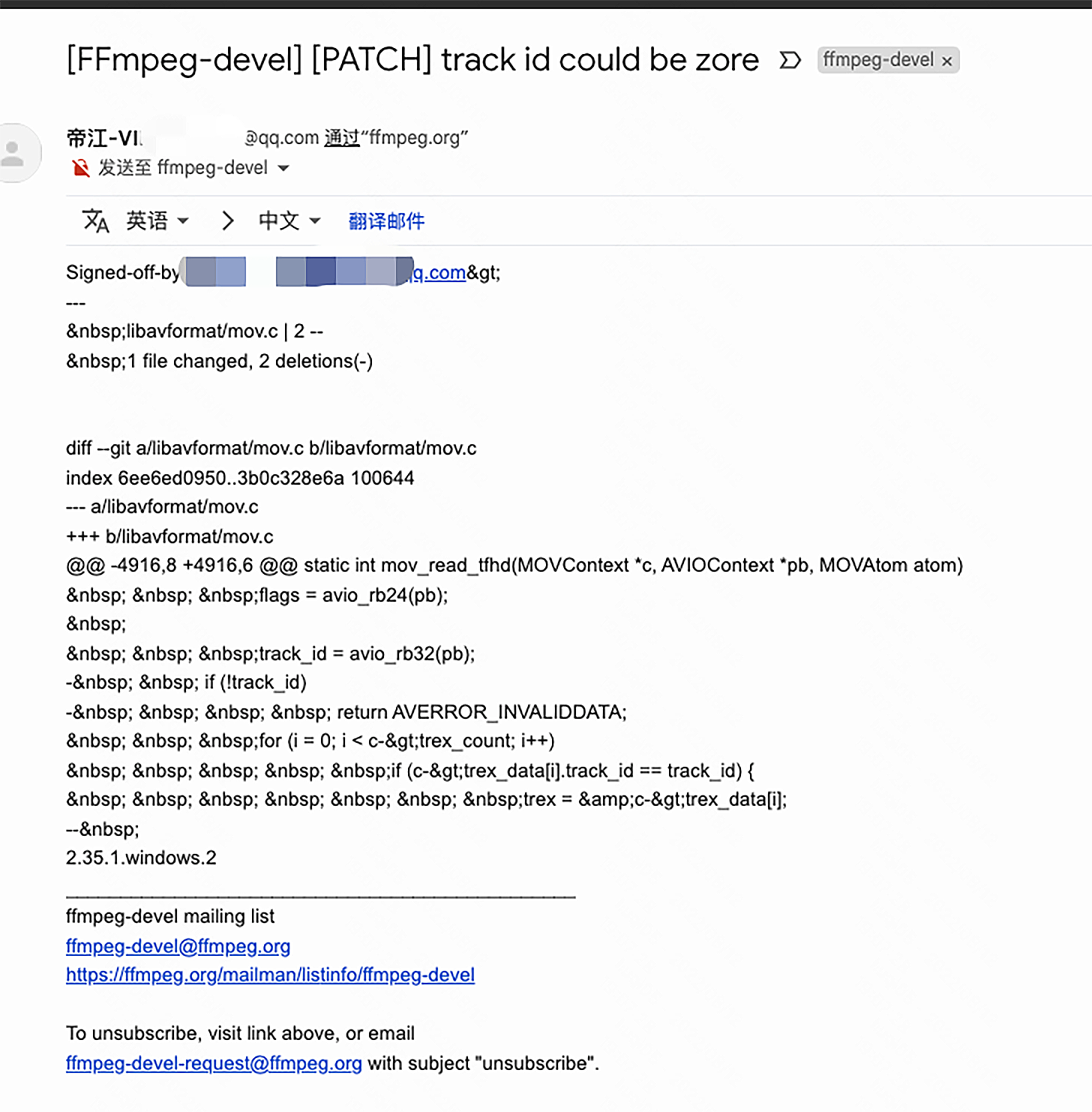 这个patch发送得比较失败,内容乱码,不但复制粘贴了patch内容,还用的是富文本格式。patch本身是纯文本格式,富文本格式会出现乱码。虽然我们的语言环境是中文,但是FFmpeg项目是国际项目,所以全球哪里的人都有。试想一下如果人家发德文、法文、阿拉伯文、泰文、蒙文给我们,我们是否能看懂呢?所以把中文发给他们也是一样的道理。