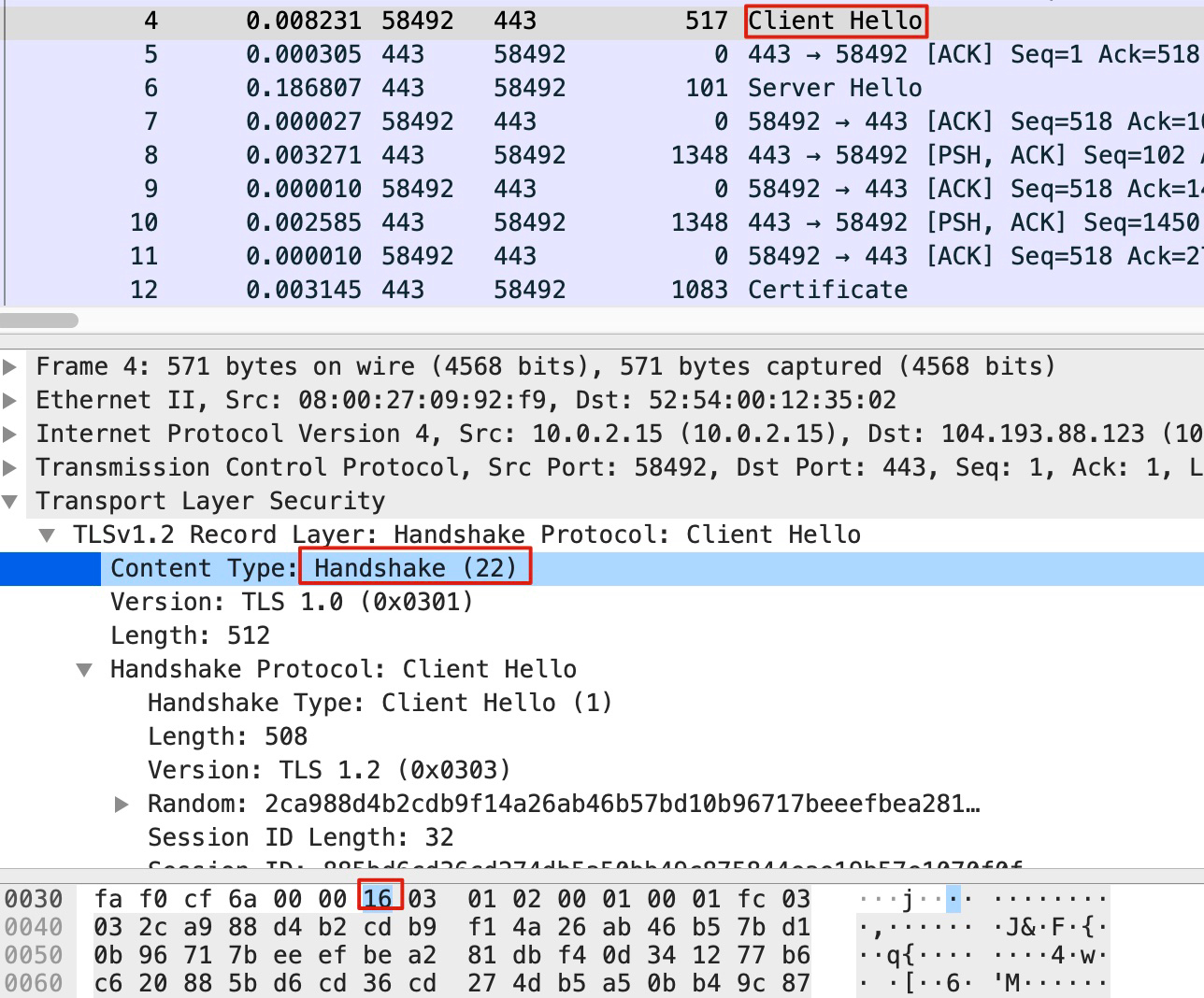 - tcp[25]==1:同理,这是TCP头部的第26个字节,如果它等于1,那么就表明这个是Client Hello类型的TLS握手报文。