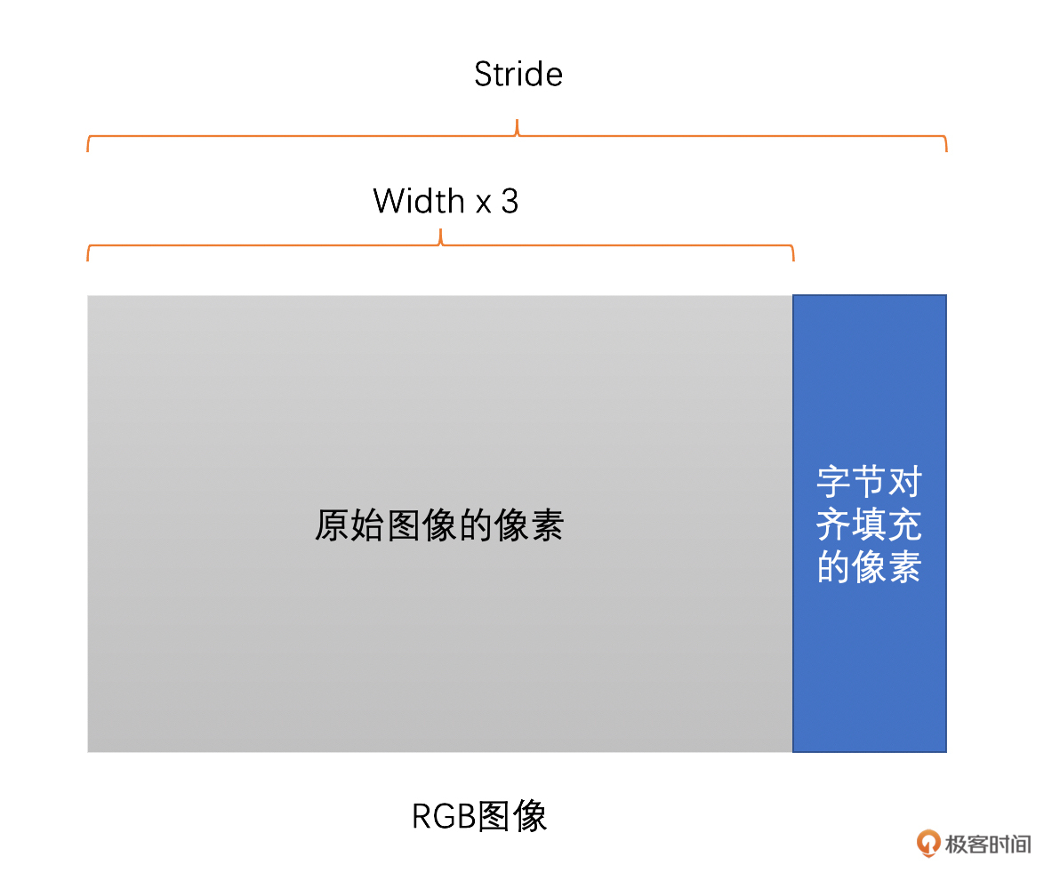 Stride也可以称之为跨距,是图像存储的时候有的一个概念。**它指的是图像存储时内存中每行像素所占用的空间。**你可能会问,一张图像的分辨率确定了,那一行的像素值不就确定了吗?为什么还需要跨距这个东西呢?其实,为了能够快速读取一行像素,我们一般会对内存中的图像实现内存对齐,比如16字节对齐。