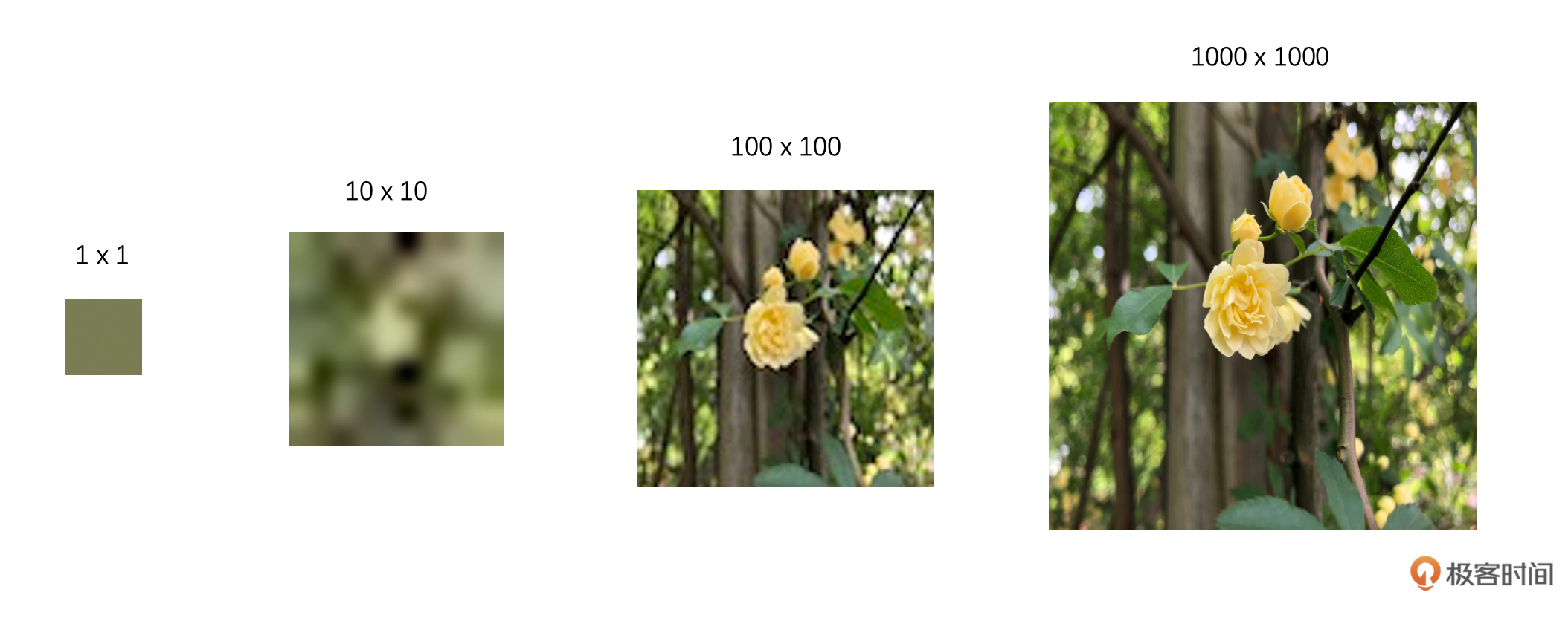 我们可以看到,1x1的时候我们只能看到一个像素,只有一种颜色,根本就不是我们想象中的图像了。而10x10的图像几乎都是糊的,只能看到一点点轮廓。随着图像的分辨率越来越高,图像的细节就越来越清晰。由此,我们可以总结出: