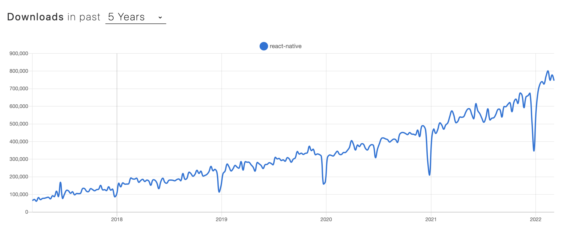 根据权威网站数据,现在使用 React Native 的开发者已经越来越多了。在 npm trends 网站上你可以看到,react-native 框架每周的下载次数,已经从5年前的不到10万次,到现在超过了 80 万次,5 年时间翻了 8 倍之多。