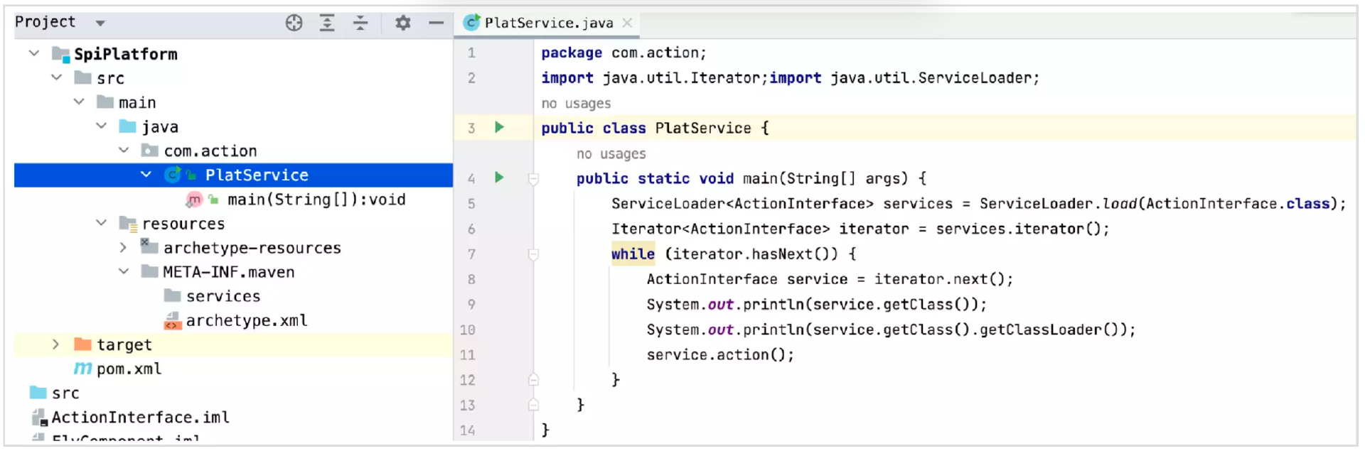- 在jar包的META-INF/services目录里创建一个文件,文件以接口的全限定名进行命名,文件内容是实现类的全限定名,方便SPI自动查找和加载实现类。