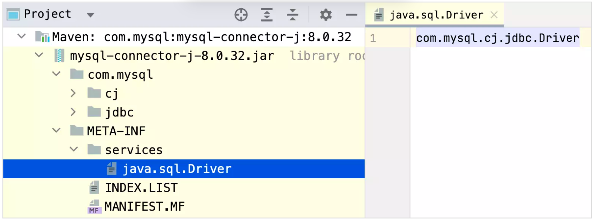 我们刚刚也提到了SPI机制的应用范围很广,比如MySQL就很好地应用了这一机制,提升了扩展性和灵活性。下面我们看下mysql-connector的具体实践,可以看到它遵循了SPI的规范,在META-INF/services目录下维护了一个以实现接口名命名的文件java.sql.Driver,表示它实现的是java.sql.Driver这个接口,具体的实现类的全限定名就是文件里的具体内容com.mysql.cj.jdbc.Driver。你可以通过下面我给出的代码体会一下。