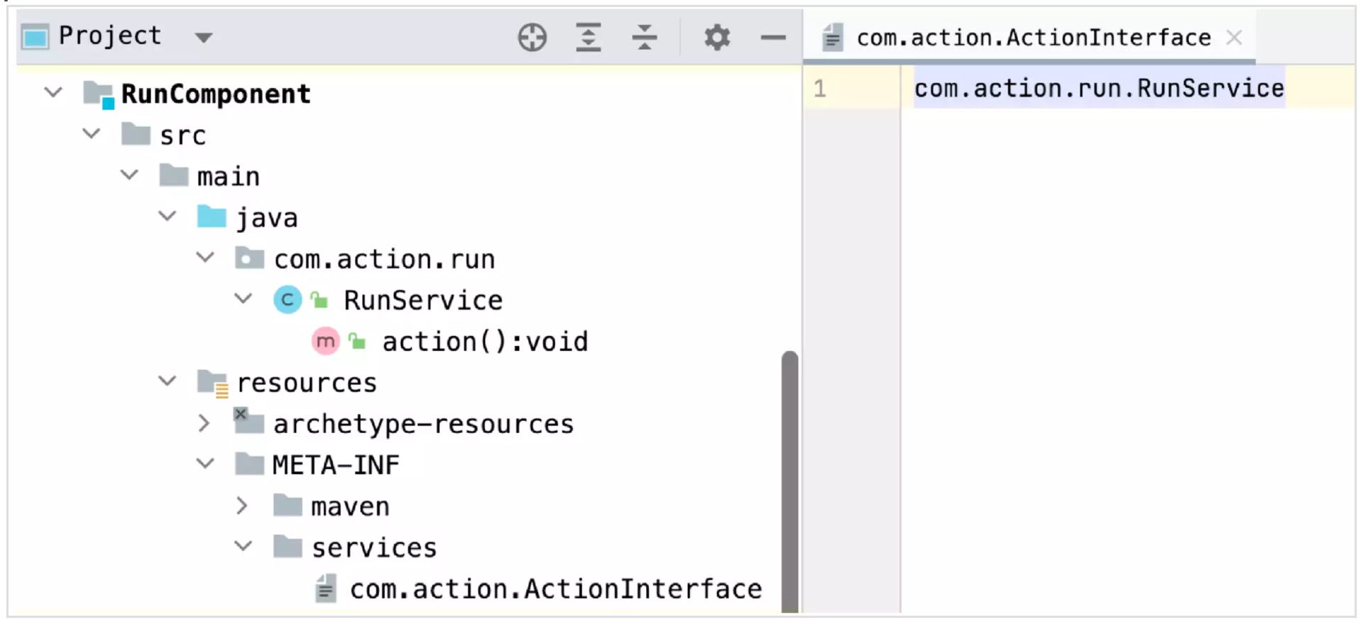 开发者A遵循了SPI约定,在实现这个接口后,把实现类打成 jar 包,同时在 jar 包中创建了一个文件夹,名字是 META-INF/services,里面有个文件,文件名字为待实现接口的全限定名com.action.ActionInterface,这个文件里只有一行内容,是 com.action.fly.FlyService,也就是实现类的全限定名。