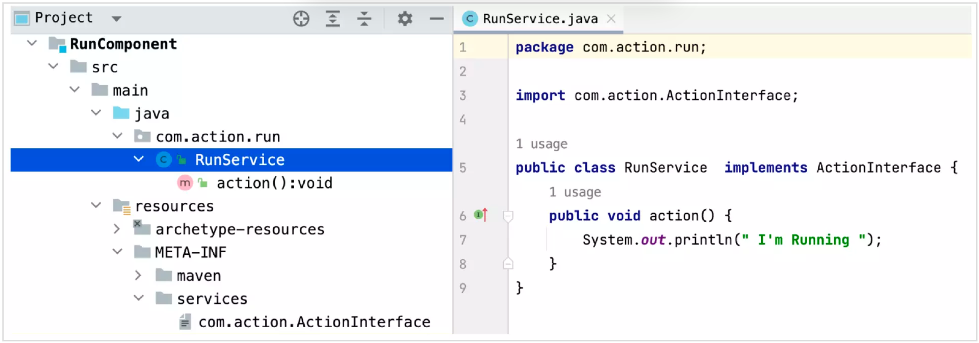 接下来,我们假定有一个开发者A,他准备提供 action() 的解决方案,他也创建一个Maven 工程 FlyComponent,然后实现了ActionInterface接口。