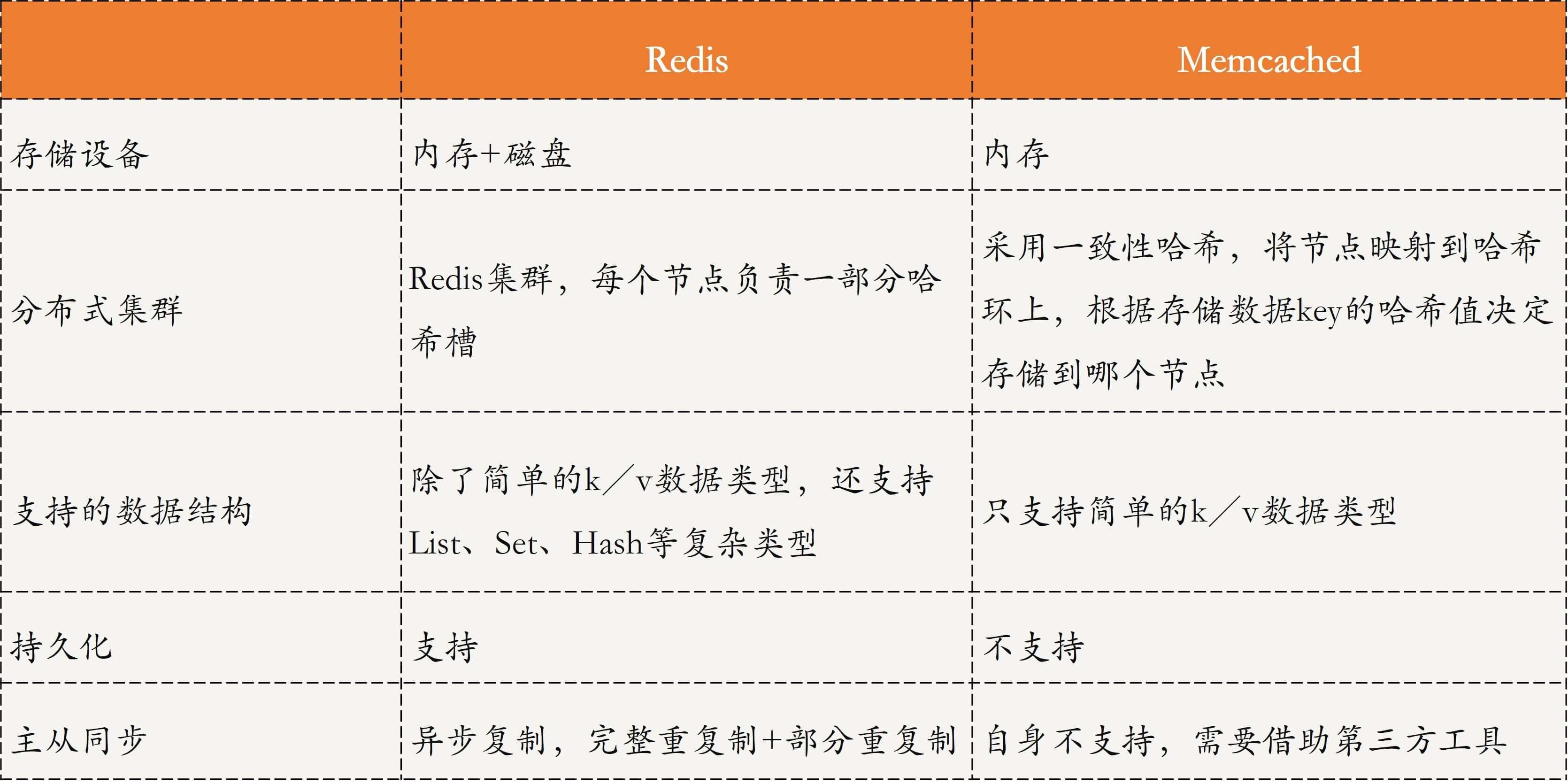 其次,我以主流的Redis和Memcached为例,与你介绍了分布式缓存技术中的关键技术,包括支持的数据存储结构(比如k/v、Set、List等)、持久化技术(包括快照方式等)和数据同步技术(具体技术原理,可参见[第26篇文章])。