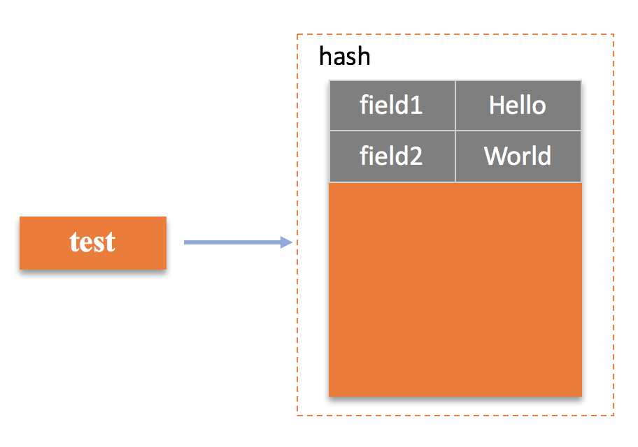 比如,插入Hash数据类型的命令:HMSET test field1 “Hello” field2 “World”中,如下图所示,test为key值, field1 “Hello” field2 “World” 为value值,如果把整个Hash结构看做对象的话,则field1、field2类似于对象中的属性名,“Hello”“World”类似于对象中的属性值。