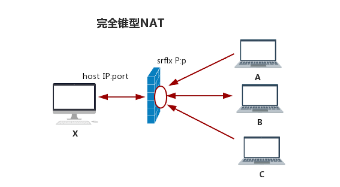 完全锥型 NAT 的特点是,当 host 主机通过 NAT 访问外网的 B 主机时,就会在 NAT 上打个“洞”,所有知道这个“洞”的主机都可以通过它与内网主机上的侦听程序通信。