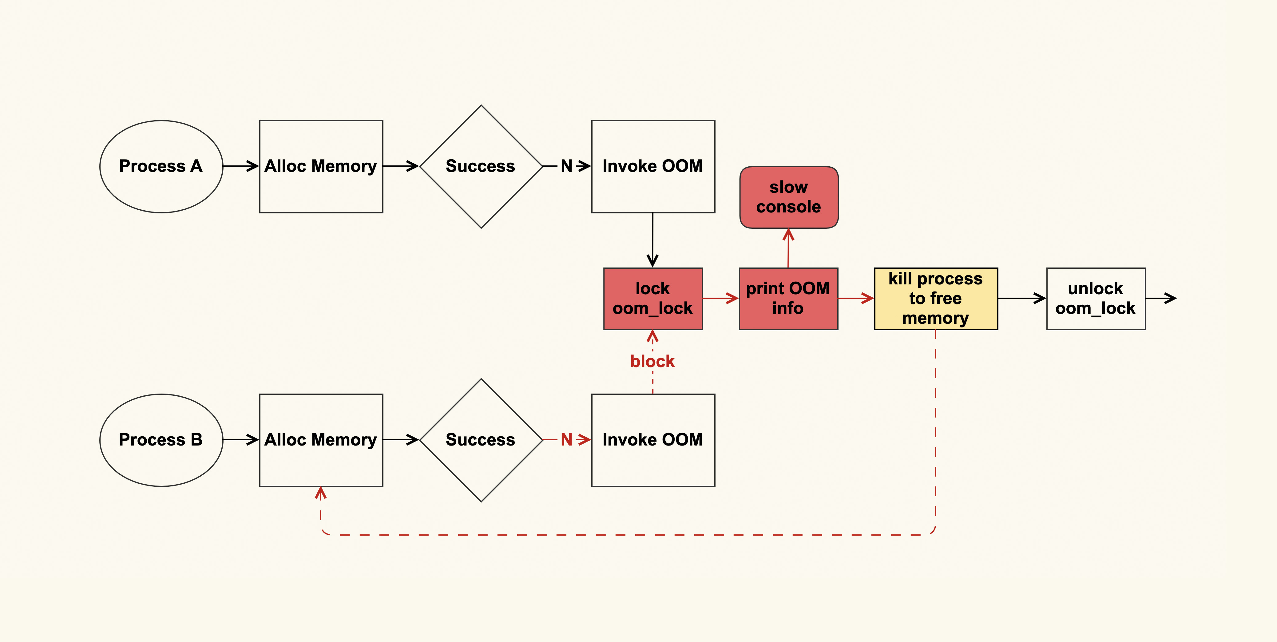 如果这个OOM的过程耗时很长(即打印到slow console所需的时间太长,如上图红色部分所示),其他进程(进程B)也在此时申请内存,也会申请失败,于是进程B同样也会触发OOM来尝试释放内存,而OOM这里又有一个全局锁(oom_lock)来进行保护,进程B尝试获取(trylock)这个锁的时候会失败,就只能再次重试。