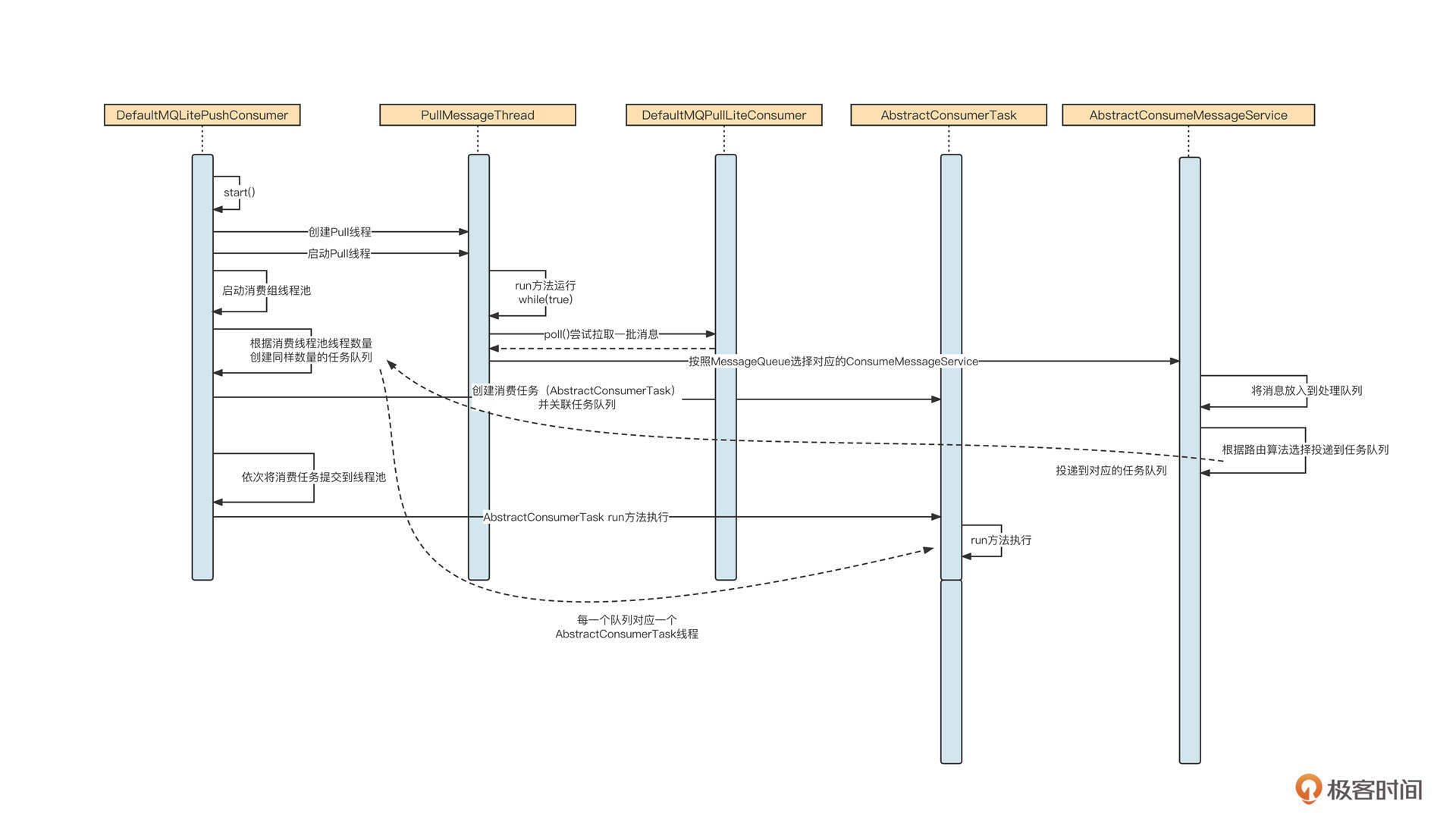 - 调用DefaultMQLitePushConsumer的start方法后,会依次启动Pull线程(消息拉取线程)、消费组线程池、消息处理队列与消费处理任务。这里的重点是,一个AbstractConsumerTask代表一个消费线程,一个AbstractConsumerTask关联一个任务队列,消息在按照Key路由后会放入指定的任务队列,从而被指定线程处理。