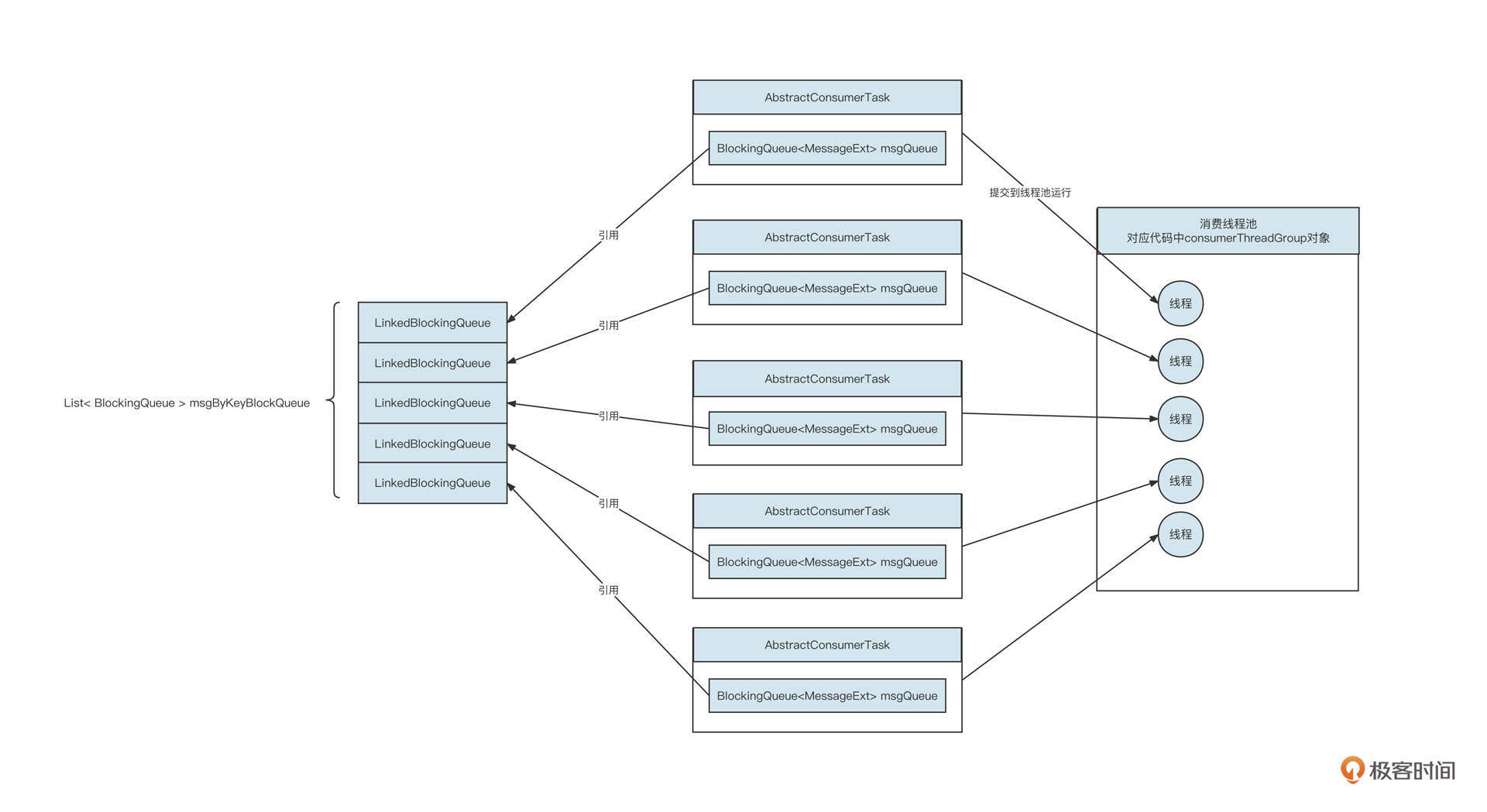 - 第13行:创建consumerThreadCont个AbstractConsumerTask任务,每一个task关联一个LinkedBlockingQueue任务队列,然后将AbstractConsumerTask提交到线程池中执行。
