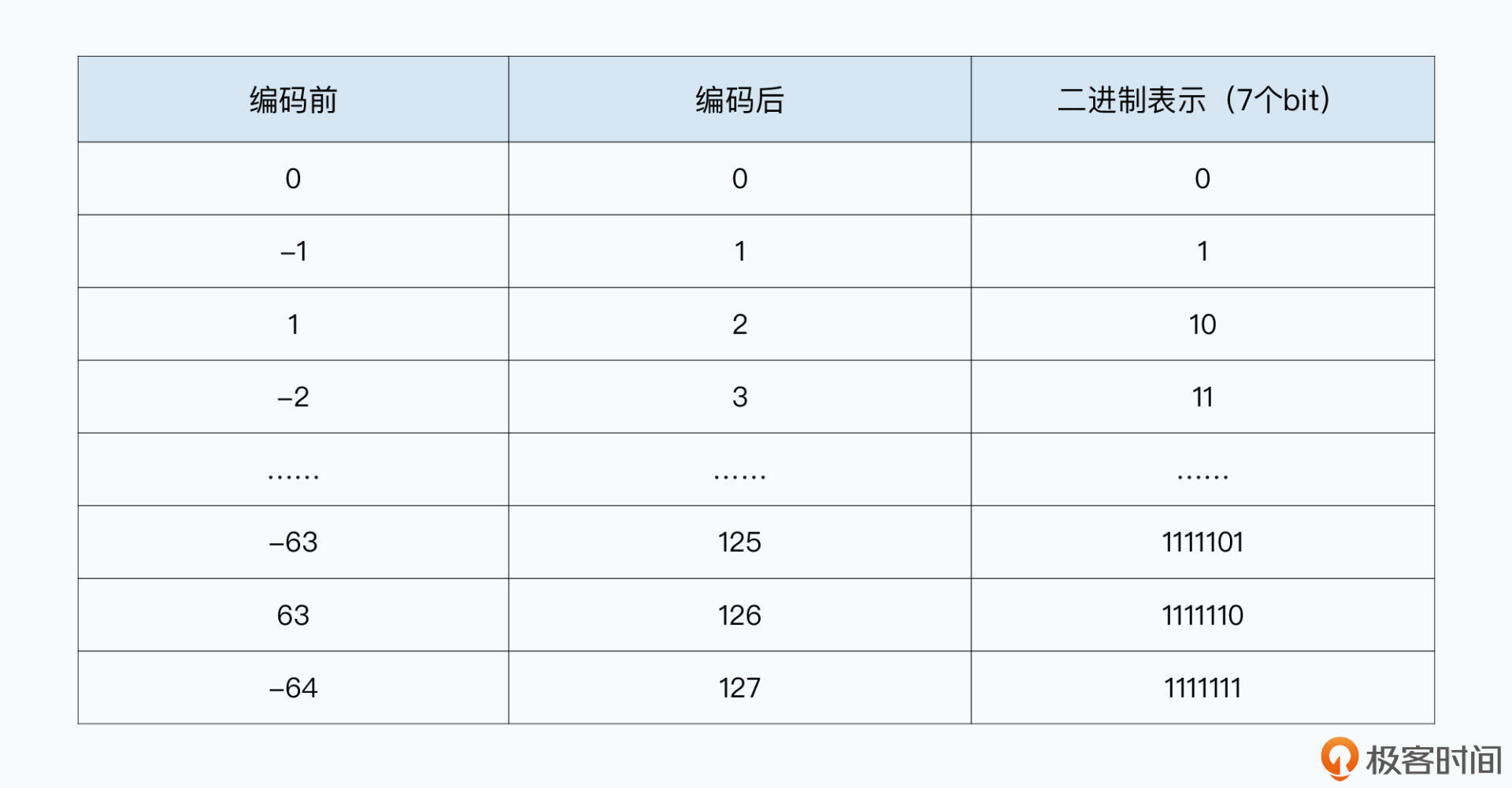 简单来说,就是负数变成正数,而正数去乘以2。这样的情况下,7个bit就可以表示-64到63这128个数了。