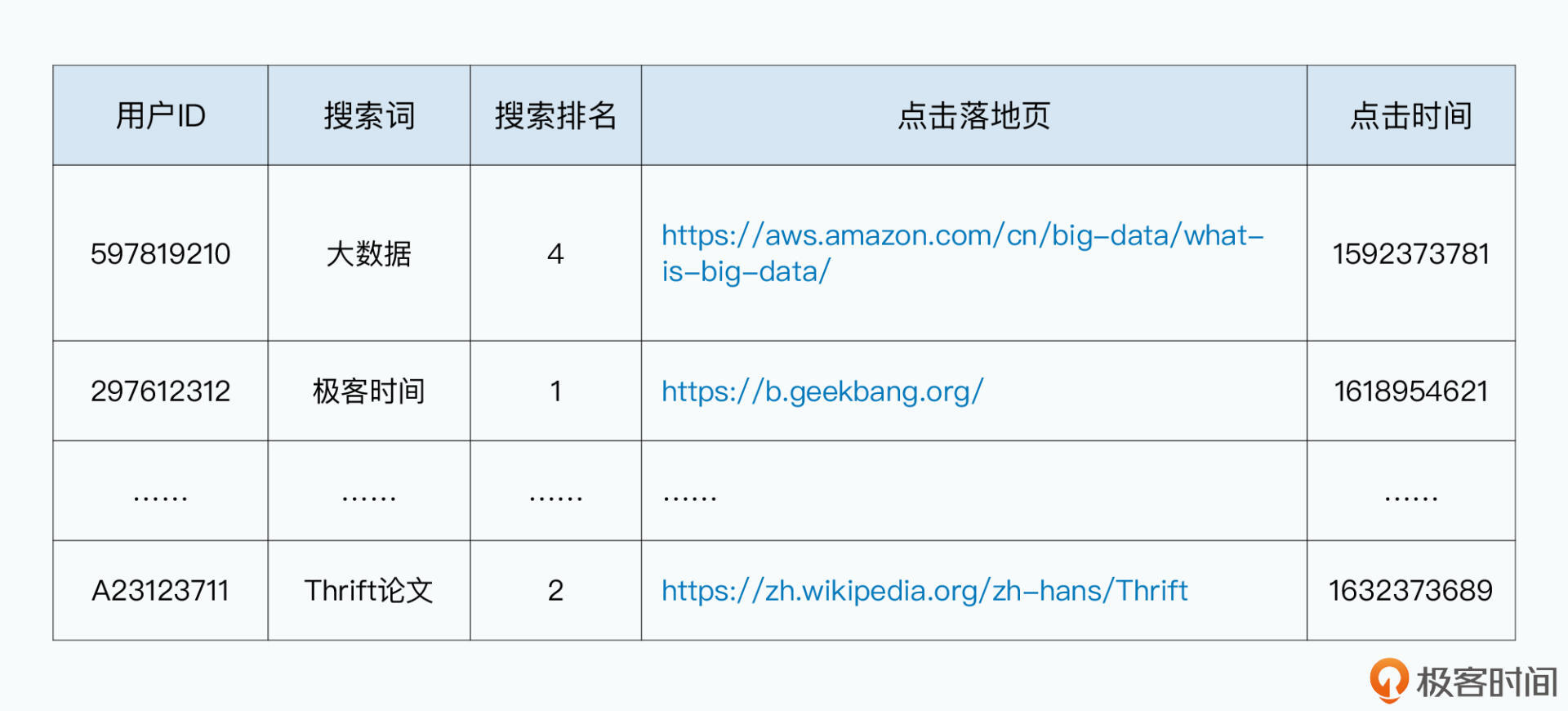 如果你是做后端开发的,那么日常读写数据最常见的办法之一,无非就是CSV格式。举一个最简单的例子,要想把Google这样的搜索引擎,每一次搜索后的用户点击记录给存储下来,就会是下面这样的: