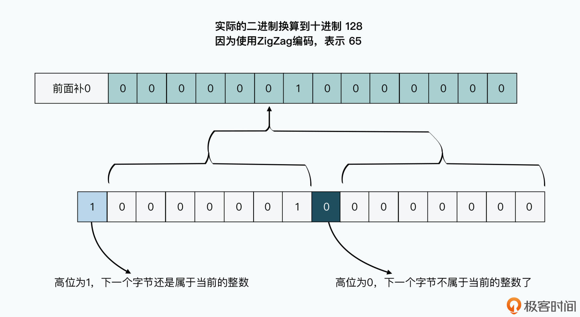 这个编码方式的每一个字节的高位,都会用第一个bit用来标记,也就是第一个bit用来标记整个整数是否还需要读入下一个字节,而后面的7个bit用来表示实际存放的数据。这样,一个32位的整型数,最少只要用一个字节来表示,最多也只需要用5个字节来表示,因为7bit x 5=35 bit已经足够有32位了。